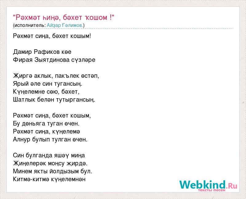 Рәхмәт сиңа, бәхет кошым! Дамир Рафиков көе Фирая Зыятдинова сүзләре Җиргә аклык, пакълек өстәп, Ярый әле син тугансың. Күңелемне сөю, бәхет, Шатлык белән тутыргансың. Рәхмәт сиңа, бәхет кошым, Бу дөньяга туган өчен. Рәхмәт сиңа, күңелемә Алнур булып тулган өчен. Син булганда яшәү миңа Җиңелерәк моңсу җирдә. Минем якты йолдызым бул. Китмә-китмә күңелемнән
