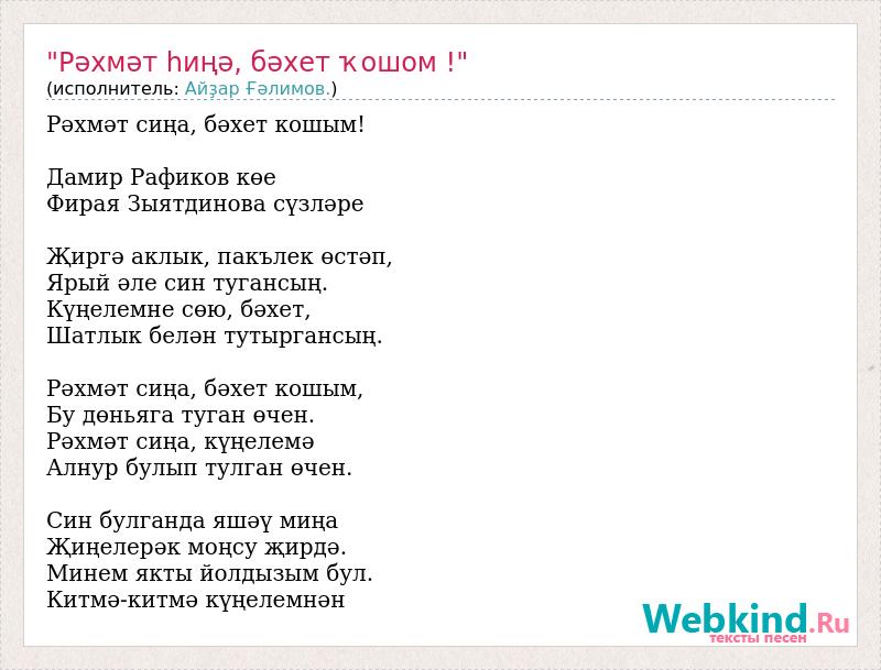 Рәхмәт сиңа, бәхет кошым! Дамир Рафиков көе Фирая Зыятдинова сүзләре Җиргә аклык, пакълек өстәп, Ярый әле син тугансың. Күңелемне сөю, бәхет, Шатлык белән тутыргансың. Рәхмәт сиңа, бәхет кошым, Бу дөньяга туган өчен. Рәхмәт сиңа, күңелемә Алнур булып тулган өчен. Син булганда яшәү миңа Җиңелерәк моңсу җирдә. Минем якты йолдызым бул. Китмә-китмә күңелемнән