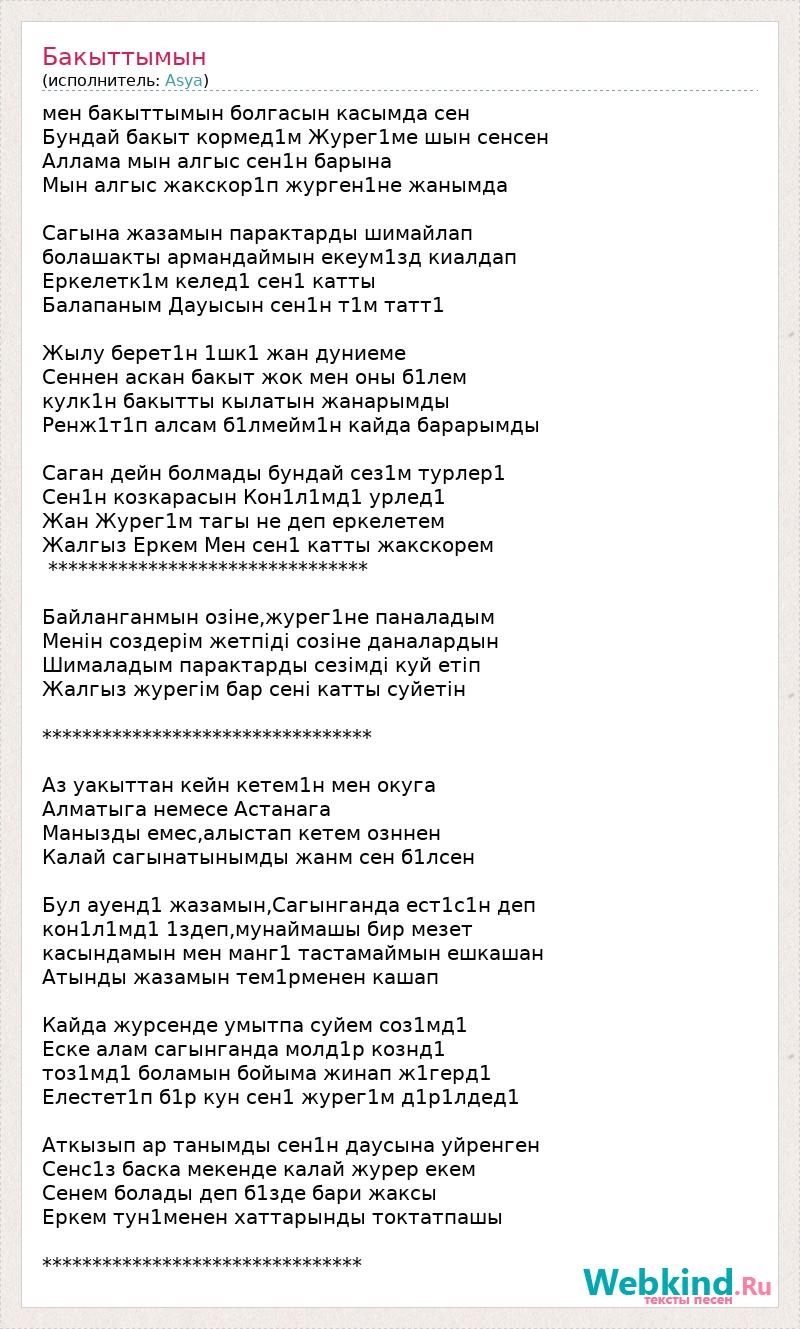 мен бакыттымын болгасын касымда сен Бундай бакыт кормед1м Журег1ме шын сенсен Аллама мын алгыс сен1н барына Мын алгыс жакскор1п журген1не жанымда Сагына жазамын парактарды шимайлап болашакты армандаймын екеум1зд киалдап Еркелетк1м келед1 сен1 катты Балапаным Дауысын сен1н т1м татт1 Жылу берет1н 1шк1 жан дуниеме Сеннен аскан бакыт жок мен оны б1лем кулк1н бакытты кылатын жанарымды Ренж1т1п алсам б1лмейм1н кайда барарымды Саган дейн болмады бундай сез1м турлер1 Сен1н козкарасын Кон1л1мд1 урлед1 Жан Журег1м тагы не деп еркелетем Жалгыз Еркем Мен сен1 катты жакскорем ******************************** Байланганмын озiне,журег1не паналадым Менiн создерiм жетпiдi созiне даналардын Шималадым парактарды сезiмдi куй етiп Жалгыз журегiм бар сенi катты суйетiн ********************************* Аз уакыттан кейн кетем1н мен окуга Алматыга немесе Астанага Манызды емес,алыстап кетем озннен Калай сагынатынымды жанм сен б1лсен Бул ауенд1 жазамын,Сагынганда ест1с1н деп кон1л1мд1 1здеп,мунаймашы бир мезет касындамын мен манг1 тастамаймын ешкашан Атынды жазамын тем1рменен кашап Кайда журсенде умытпа суйем соз1мд1 Еске алам сагынганда молд1р кознд1 тоз1мд1 боламын бойыма жинап ж1герд1 Елестет1п б1р кун сен1 журег1м д1р1лдед1 Аткызып ар танымды сен1н даусына уйренген Сенс1з баска мекенде калай журер екем Сенем болады деп б1зде бари жаксы Еркем тун1менен хаттарынды токтатпашы ********************************