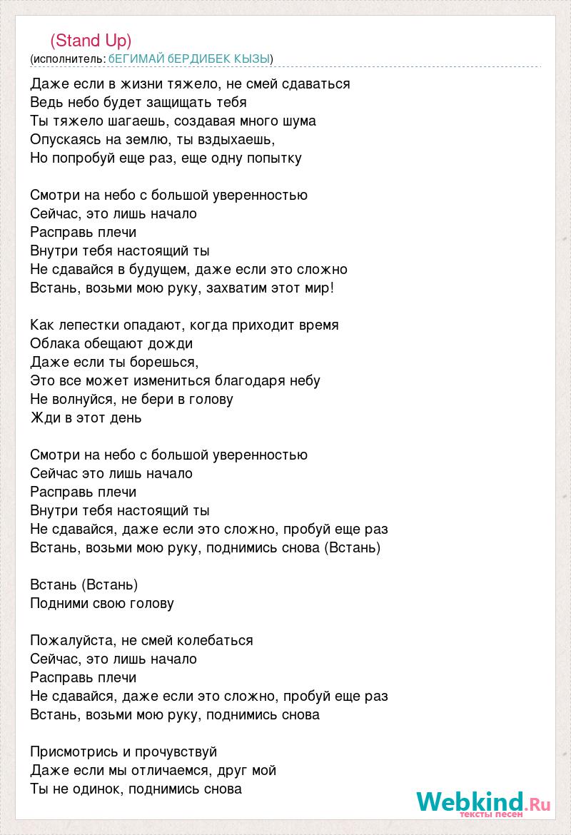 Даже если в жизни тяжело, не смей сдаваться Ведь небо будет защищать тебя Ты тяжело шагаешь, создавая много шума Опускаясь на землю, ты вздыхаешь, Но попробуй еще раз, еще одну попытку Смотри на небо с большой уверенностью Сейчас, это лишь начало Расправь плечи Внутри тебя настоящий ты Не сдавайся в будущем, даже если это сложно Встань, возьми мою руку, захватим этот мир! Как лепестки опадают, когда приходит время Облака обещают дожди Даже если ты борешься, Это все может измениться благодаря небу Не волнуйся, не бери в голову Жди в этот день Смотри на небо с большой уверенностью Сейчас это лишь начало Расправь плечи Внутри тебя настоящий ты Не сдавайся, даже если это сложно, пробуй еще раз Встань, возьми мою руку, поднимись снова (Встань) Встань (Встань) Подними свою голову Пожалуйста, не смей колебаться Сейчас, это лишь начало Расправь плечи Не сдавайся, даже если это сложно, пробуй еще раз Встань, возьми мою руку, поднимись снова Присмотрись и прочувствуй Даже если мы отличаемся, друг мой Ты не одинок, поднимись снова
