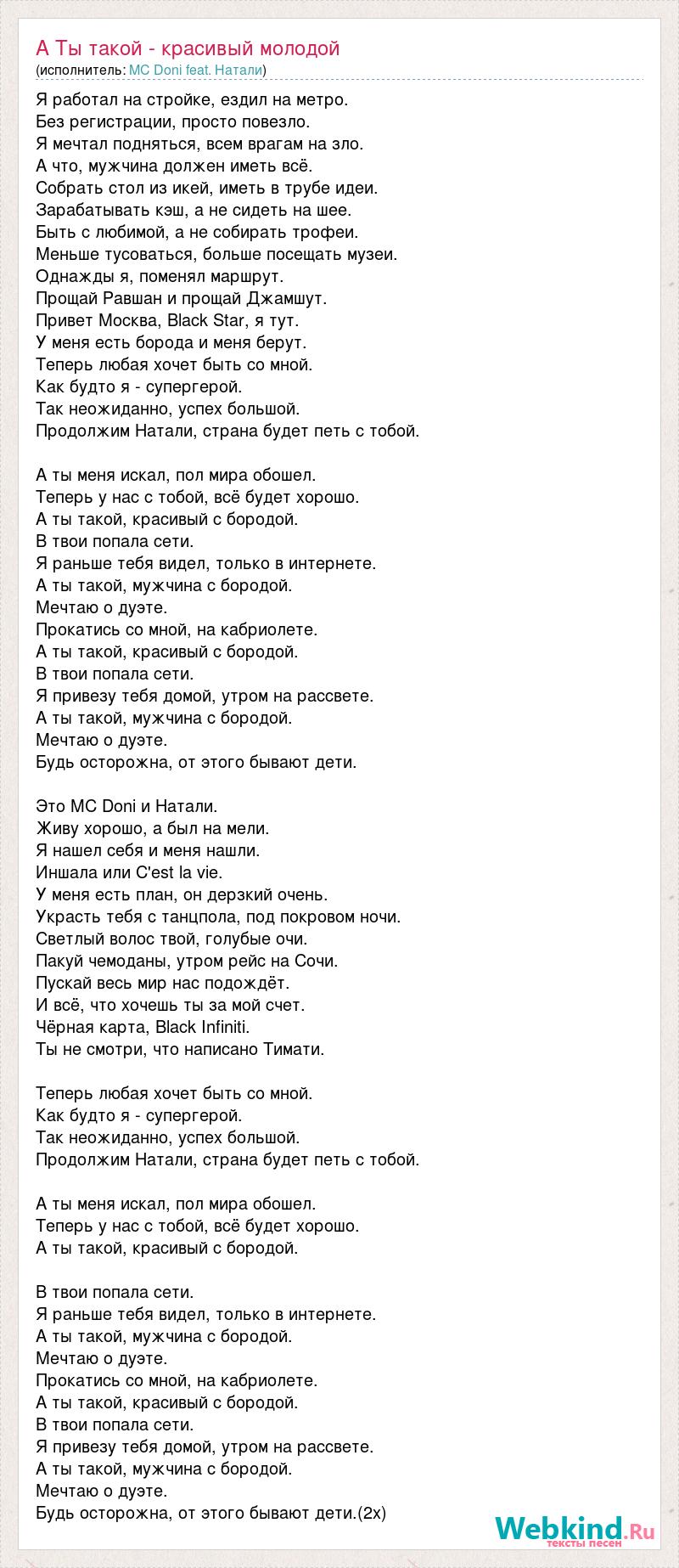 Я работал на стройке, ездил на метро. Без регистрации, просто повезло. Я мечтал подняться, всем врагам на зло. А что, мужчина должен иметь всё. Собрать стол из икей, иметь в трубе идеи. Зарабатывать кэш, а не сидеть на шее. Быть с любимой, а не собирать трофеи. Меньше тусоваться, больше посещать музеи. Однажды я, поменял маршрут. Прощай Равшан и прощай Джамшут. Привет Москва, Black Star, я тут. У меня есть борода и меня берут. Теперь любая хочет быть со мной. Как будто я - супергерой. Так неожиданно, успех большой. Продолжим Натали, страна будет петь с тобой. А ты меня искал, пол мира обошел. Теперь у нас с тобой, всё будет хорошо. А ты такой, красивый с бородой. В твои попала сети. Я раньше тебя видел, только в интернете. А ты такой, мужчина с бородой. Мечтаю о дуэте. Прокатись со мной, на кабриолете. А ты такой, красивый с бородой. В твои попала сети. Я привезу тебя домой, утром на рассвете. А ты такой, мужчина с бородой. Мечтаю о дуэте. Будь осторожна, от этого бывают дети. Это MC Doni и Натали. Живу хорошо, а был на мели. Я нашел себя и меня нашли. Иншала или C'est la vie. У меня есть план, он дерзкий очень. Украсть тебя с танцпола, под покровом ночи. Светлый волос твой, голубые очи. Пакуй чемоданы, утром рейс на Сочи. Пускай весь мир нас подождёт. И всё, что хочешь ты за мой счет. Чёрная карта, Black Infiniti. Ты не смотри, что написано Тимати. Теперь любая хочет быть со мной. Как будто я - супергерой. Так неожиданно, успех большой. Продолжим Натали, страна будет петь с тобой. А ты меня искал, пол мира обошел. Теперь у нас с тобой, всё будет хорошо. А ты такой, красивый с бородой. В твои попала сети. Я раньше тебя видел, только в интернете. А ты такой, мужчина с бородой. Мечтаю о дуэте. Прокатись со мной, на кабриолете. А ты такой, красивый с бородой. В твои попала сети. Я привезу тебя домой, утром на рассвете. А ты такой, мужчина с бородой. Мечтаю о дуэте. Будь осторожна, от этого бывают дети.(2х)