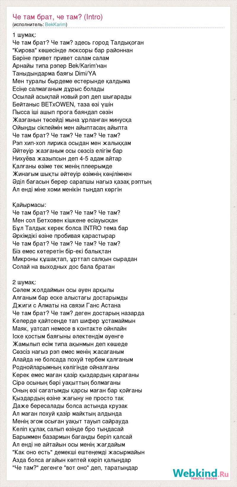 1 шумақ: Че там брат? Че там? здесь город Талдықоған "Кирова" көшесінде люксоры бар районнан Бәріне привет привет салам салам Арнайы типа рэпер Bek/Karim'нан Таныдындарма баяғы Dimi/YA Мен туралы бырдеме естерынде қалдыма Есіңе салмағаным дұрыс болады Осылай асықпай новый рэп деп шығарады Бейтаныс BETxOWEN, таза өзі үшін Пысса іші ашып прога баяндап сөзін Жазғанын төсейді мына ұрланған минусқа Ойыңды сікпеймін мен айыптасаң айыпта Че там брат? Че там? Че там? Че там? Рэп хип-хоп лирика осыдан мен жалыққам Әйтеуір жазғаным осы сөзсіз елігім бар Нихуёва жазыпсын деп 4-5 адам айтар Қалғаны өзіме тек менің плеерымде Жинағым шықты әйтеуір өзімнің көңілімнен Әділ бағасын берер сарапшы нағыз қазақ рэптың Ал енді міне хоми менікін тыңдап көргін Қайырмасы: Че там брат? Че там? Че там? Че там? Мен сол Бетховен кішкене есіауысқан Бұл Талдык керек болса INTRO тема бар Әркімдікі өзіне пробивая қарастырар Че там брат? Че там? Че там? Че там? Біз емес көтеретін бір-екі балықтан Микроны құшақтап, ұрттап салқын сырадан Солай на выходных дос бала братан 2 шумақ: Cәлем жолдаймын осы әуен арқылы Алғаным бар еске алыстағы достарымды Джиги с Алматы на связи Ганс Астана Че там брат? Че там? деген достарың назарда Келерде қайтсеңде тап шифер ұстамаймын Маяк, уатсап немесе в контакте ойнлайн Іске қостым баяғыны әлектендім әуенге Жамылып есім типа ақынмын деп көшеде Сөзсіз нағыз рэп емес менің жасағаным Алайда не болсада похуй тербем қалғаным Роднойларымның көлігінде ойналғаны Керек емес маған қазір қыздардың қарағаны Сірә осының бәрі уақыттың болмағаны Оның өзі сағатымды қарсы маған бар қойғаны Қыздардың өзіне жағыну не просто так Даже бересалады болса астында крузак Ал маған похуй қазір майктың алдында Менің эгом осыған уақыт тауып сайрауда Келіп құлақ салып өзіңде бро тыңдасай Барыммен базармын бағаңды беріп қалсай Ал енді не айтайын осы менің жағдайым "Как оно есть" демекші ештеңемді жасырмайын Азда болса ағайын көптей көріп қалыңдар "Че там?" дегенге "вот оно" деп, таратыңдар