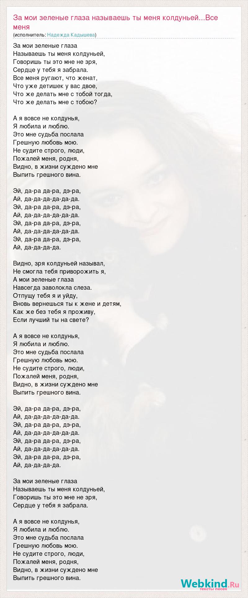За мои зеленые глаза Называешь ты меня колдуньей, Говоришь ты это мне не зря, Сердце у тебя я забрала. Все меня ругают, что женат, Что уже детишек у вас двое, Что же делать мне с тобой тогда, Что же делать мне с тобою? А я вовсе не колдунья, Я любила и люблю. Это мне судьба послала Грешную любовь мою. Не судите строго, люди, Пожалей меня, родня, Видно, в жизни суждено мне Выпить грешного вина. Эй, да-ра да-ра, дэ-ра, Ай, да-да-да-да-да-да. Эй, да-ра да-ра, дэ-ра, Ай, да-да-да-да-да-да. Эй, да-ра да-ра, дэ-ра, Ай, да-да-да-да-да-да. Эй, да-ра да-ра, дэ-ра, Ай, да-да-да-да. Видно, зря колдуньей называл, Не смогла тебя приворожить я, А мои зеленые глаза Навсегда заволокла слеза. Отпущу тебя я и уйду, Вновь вернешься ты к жене и детям, Как же без тебя я проживу, Если лучший ты на свете? А я вовсе не колдунья, Я любила и люблю. Это мне судьба послала Грешную любовь мою. Не судите строго, люди, Пожалей меня, родня, Видно, в жизни суждено мне Выпить грешного вина. Эй, да-ра да-ра, дэ-ра, Ай, да-да-да-да-да-да. Эй, да-ра да-ра, дэ-ра, Ай, да-да-да-да-да-да. Эй, да-ра да-ра, дэ-ра, Ай, да-да-да-да-да-да. Эй, да-ра да-ра, дэ-ра, Ай, да-да-да-да. За мои зеленые глаза Называешь ты меня колдуньей, Говоришь ты это мне не зря, Сердце у тебя я забрала. А я вовсе не колдунья, Я любила и люблю. Это мне судьба послала Грешную любовь мою. Не судите строго, люди, Пожалей меня, родня, Видно, в жизни суждено мне Выпить грешного вина.