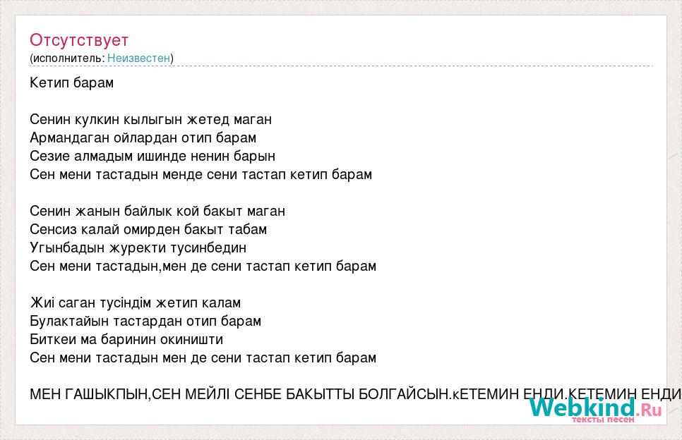 Кетип барам Сенин кулкин кылыгын жетед маган Армандаган ойлардан отип барам Сезие алмадым ишинде ненин барын Сен мени тастадын менде сени тастап кетип барам Сенин жанын байлык кой бакыт маган Сенсиз калай омирден бакыт табам Угынбадын журекти тусинбедин Сен мени тастадын,мен де сени тастап кетип барам Жиі саган тусіндім жетип калам Булактайын тастардан отип барам Биткеи ма баринин окиништи Сен мени тастадын мен де сени тастап кетип барам МЕН ГАШЫКПЫН,СЕН МЕЙЛІ СЕНБЕ БАКЫТТЫ БОЛГАЙСЫН.кЕТЕМИН ЕНДИ.КЕТЕМИН ЕНДИ