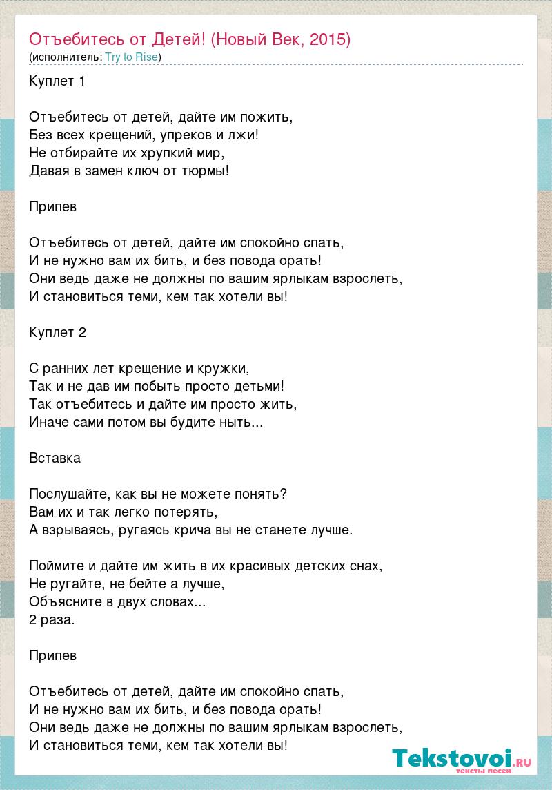 Куплет 1 Отъебитесь от детей, дайте им пожить, Без всех крещений, упреков и лжи! Не отбирайте их хрупкий мир, Давая в замен ключ от тюрмы! Припев Отъебитесь от детей, дайте им спокойно спать, И не нужно вам их бить, и без повода орать! Они ведь даже не должны по вашим ярлыкам взрослеть, И становиться теми, кем так хотели вы! Куплет 2 С ранних лет крещение и кружки, Так и не дав им побыть просто детьми! Так отъебитесь и дайте им просто жить, Иначе сами потом вы будите ныть... Вставка Послушайте, как вы не можете понять? Вам их и так легко потерять, А взрываясь, ругаясь крича вы не станете лучше. Поймите и дайте им жить в их красивых детских снах, Не ругайте, не бейте а лучше, Объясните в двух словах... 2 раза. Припев Отъебитесь от детей, дайте им спокойно спать, И не нужно вам их бить, и без повода орать! Они ведь даже не должны по вашим ярлыкам взрослеть, И становиться теми, кем так хотели вы!