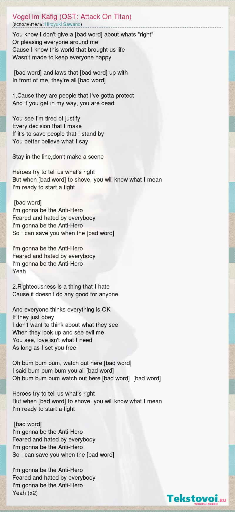 You know I don't give a [bad word] about whats "right" Or pleasing everyone around me Cause I know this world that brought us life Wasn't made to keep everyone happy [bad word] and laws that [bad word] up with In front of me, they're all [bad word] 1.Cause they are people that I've gotta protect And if you get in my way, you are dead You see I'm tired of justify Every decision that I make If it's to save people that I stand by You better believe what I say Stay in the line,don't make a scene Heroes try to tell us what's right But when [bad word] to shove, you will know what I mean I'm ready to start a fight [bad word] I'm gonna be the Anti-Hero Feared and hated by everybody I'm gonna be the Anti-Hero So I can save you when the [bad word] I'm gonna be the Anti-Hero Feared and hated by everybody I'm gonna be the Anti-Hero Yeah 2.Righteousness is a thing that I hate Cause it doesn't do any good for anyone And everyone thinks everything is OK If they just obey I don't want to think about what they see When they look up and see evil me You see, love isn't what I need As long as I set you free Oh bum bum bum, watch out here [bad word] I said bum bum bum you all [bad word] Oh bum bum bum watch out here [bad word] [bad word] Heroes try to tell us what's right But when [bad word] to shove, you will know what I mean I'm ready to start a fight [bad word] I'm gonna be the Anti-Hero Feared and hated by everybody I'm gonna be the Anti-Hero So I can save you when the [bad word] I'm gonna be the Anti-Hero Feared and hated by everybody I'm gonna be the Anti-Hero Yeah (x2)
