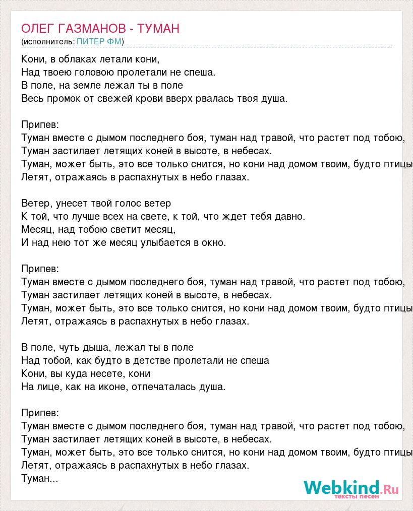 Кони, в облаках летали кони, Над твоею головою пролетали не спеша. В поле, на земле лежал ты в поле Весь промок от свежей крови вверх рвалась твоя душа. Припев: Туман вместе с дымом последнего боя, туман над травой, что растет под тобою, Туман застилает летящих коней в высоте, в небесах. Туман, может быть, это все только снится, но кони над домом твоим, будто птицы Летят, отражаясь в распахнутых в небо глазах. Ветер, унесет твой голос ветер К той, что лучше всех на свете, к той, что ждет тебя давно. Месяц, над тобою светит месяц, И над нею тот же месяц улыбается в окно. Припев: Туман вместе с дымом последнего боя, туман над травой, что растет под тобою, Туман застилает летящих коней в высоте, в небесах. Туман, может быть, это все только снится, но кони над домом твоим, будто птицы Летят, отражаясь в распахнутых в небо глазах. В поле, чуть дыша, лежал ты в поле Над тобой, как будто в детстве пролетали не спеша Кони, вы куда несете, кони На лице, как на иконе, отпечаталась душа. Припев: Туман вместе с дымом последнего боя, туман над травой, что растет под тобою, Туман застилает летящих коней в высоте, в небесах. Туман, может быть, это все только снится, но кони над домом твоим, будто птицы Летят, отражаясь в распахнутых в небо глазах. Туман...
