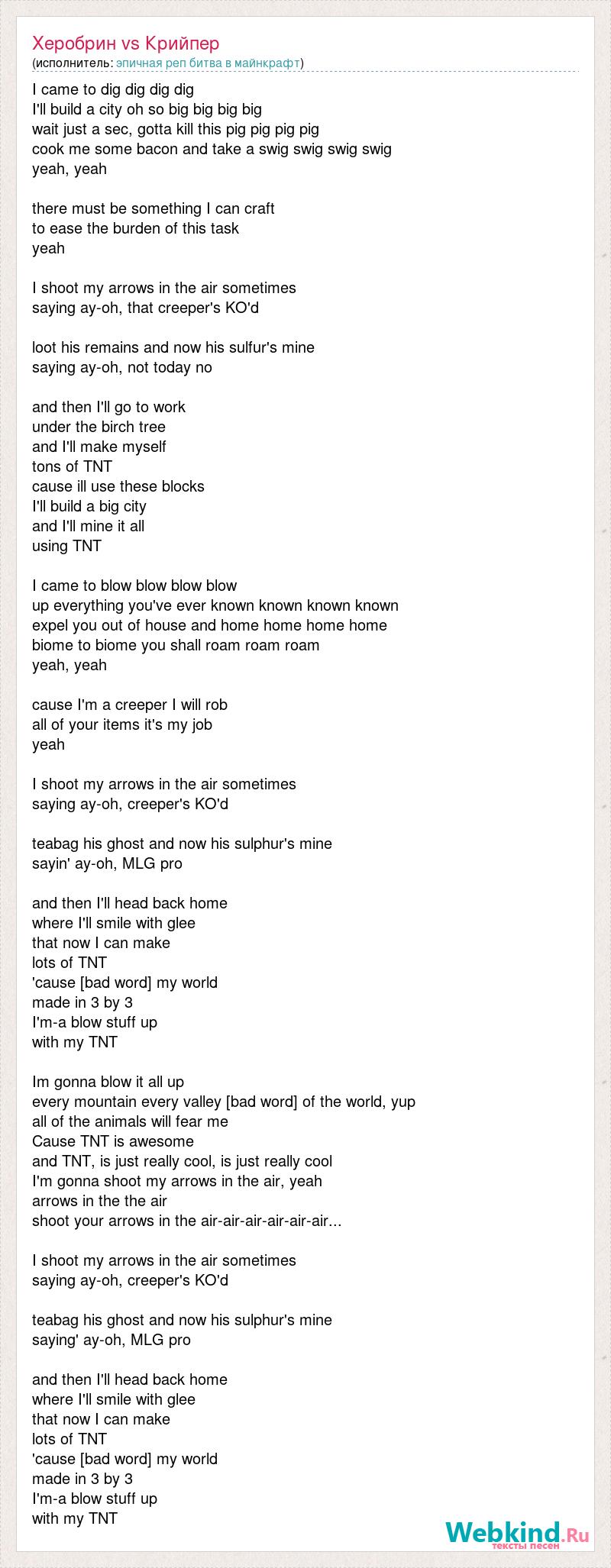 I came to dig dig dig dig I'll build a city oh so big big big big wait just a sec, gotta kill this pig pig pig pig cook me some bacon and take a swig swig swig swig yeah, yeah there must be something I can craft to ease the burden of this task yeah I shoot my arrows in the air sometimes saying ay-oh, that creeper's KO'd loot his remains and now his sulfur's mine saying ay-oh, not today no and then I'll go to work under the birch tree and I'll make myself tons of TNT cause ill use these blocks I'll build a big city and I'll mine it all using TNT I came to blow blow blow blow up everything you've ever known known known known expel you out of house and home home home home biome to biome you shall roam roam roam yeah, yeah cause I'm a creeper I will rob all of your items it's my job yeah I shoot my arrows in the air sometimes saying ay-oh, creeper's KO'd teabag his ghost and now his sulphur's mine sayin' ay-oh, MLG pro and then I'll head back home where I'll smile with glee that now I can make lots of TNT 'cause [bad word] my world made in 3 by 3 I'm-a blow stuff up with my TNT Im gonna blow it all up every mountain every valley [bad word] of the world, yup all of the animals will fear me Cause TNT is awesome and TNT, is just really cool, is just really cool I'm gonna shoot my arrows in the air, yeah arrows in the the air shoot your arrows in the air-air-air-air-air-air... I shoot my arrows in the air sometimes saying ay-oh, creeper's KO'd teabag his ghost and now his sulphur's mine saying' ay-oh, MLG pro and then I'll head back home where I'll smile with glee that now I can make lots of TNT 'cause [bad word] my world made in 3 by 3 I'm-a blow stuff up with my TNT