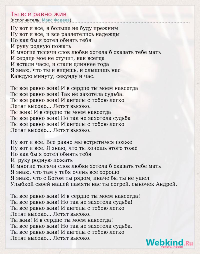 Ну вот и все, я больше не буду прежним Ну вот и все, и все разлетелись надежды Но как бы я хотел обнять тебя И руку родную пожать И многие тысячи слов любви хотела б сказать тебе мать И сердце мое не стучит, как всегда И встали часы, и стали длиннее года Я знаю, что ты и видишь, и слышишь нас Каждую минуту, секунду и час. Ты все равно жив! И в сердце ты моем навсегда Ты все равно жив! Так не захотела судьба. Ты все равно жив! И ангелы с тобою легко Летят высоко... Летят высоко. Ты жив! И в сердце ты моем навсегда Ты все равно жив! Но так не захотела судьба Ты все равно жив! И ангелы с тобою легко Летят высоко... Летят высоко. Ну вот и все. Все равно мы встретимся позже Ну вот и все. Я знаю, что ты хочешь этого тоже Но как бы я хотел обнять тебя И руку родную пожать И многие тысячи слов любви хотела б сказать тебе мать Я знаю, что там у тебя очень все хорошо Я знаю, что с Богом ты рядом, иначе бы ты не ушел Улыбкой своей нашей памяти нас ты согрей, сыночек Андрей. Ты все равно жив! И в сердце ты моем навсегда! Ты все равно жив! Но так не захотела судьба! Ты все равно жив! И ангелы с тобою легко Летят высоко... Летят высоко. Ты жив! И в сердце ты моем навсегда! Ты все равно жив! Но так не захотела судьба. Ты все равно жив! И ангелы с тобою легко Летят высоко... Летят высоко.