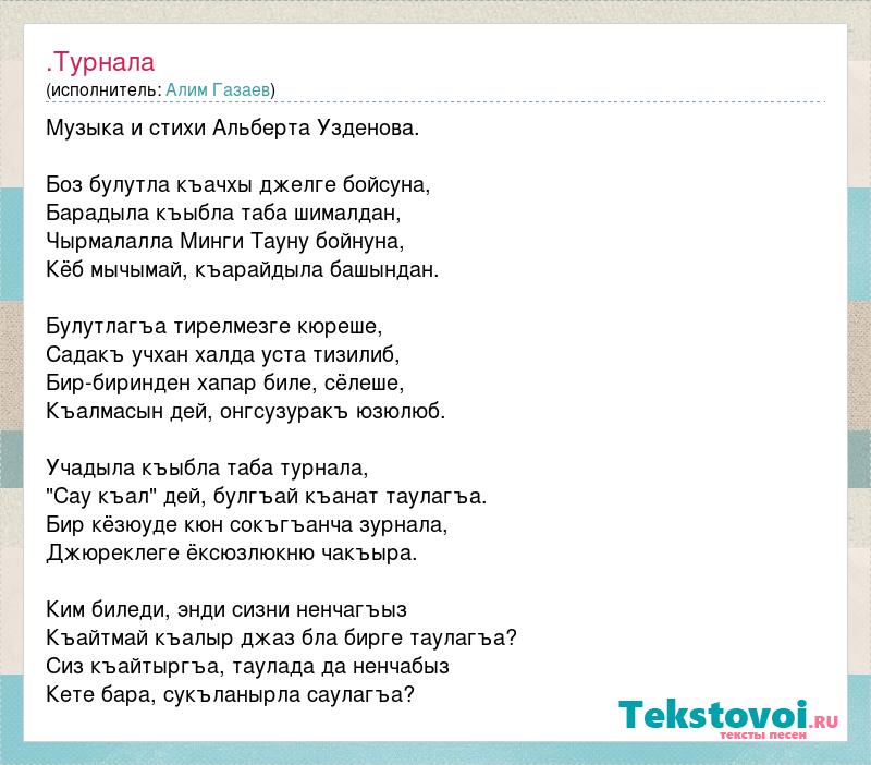 Музыка и стихи Альберта Узденова. Боз булутла къачхы джелге бойсуна, Барадыла къыбла таба шималдан, Чырмалалла Минги Тауну бойнуна, Кёб мычымай, къарайдыла башындан. Булутлагъа тирелмезге кюреше, Садакъ учхан халда уста тизилиб, Бир-биринден хапар биле, сёлеше, Къалмасын дей, онгсузуракъ юзюлюб. Учадыла къыбла таба турнала, "Сау къал" дей, булгъай къанат таулагъа. Бир кёзюуде кюн сокъгъанча зурнала, Джюреклеге ёксюзлюкню чакъыра. Ким биледи, энди сизни ненчагъыз Къайтмай къалыр джаз бла бирге таулагъа? Сиз къайтыргъа, таулада да ненчабыз Кете бара, сукъланырла саулагъа?