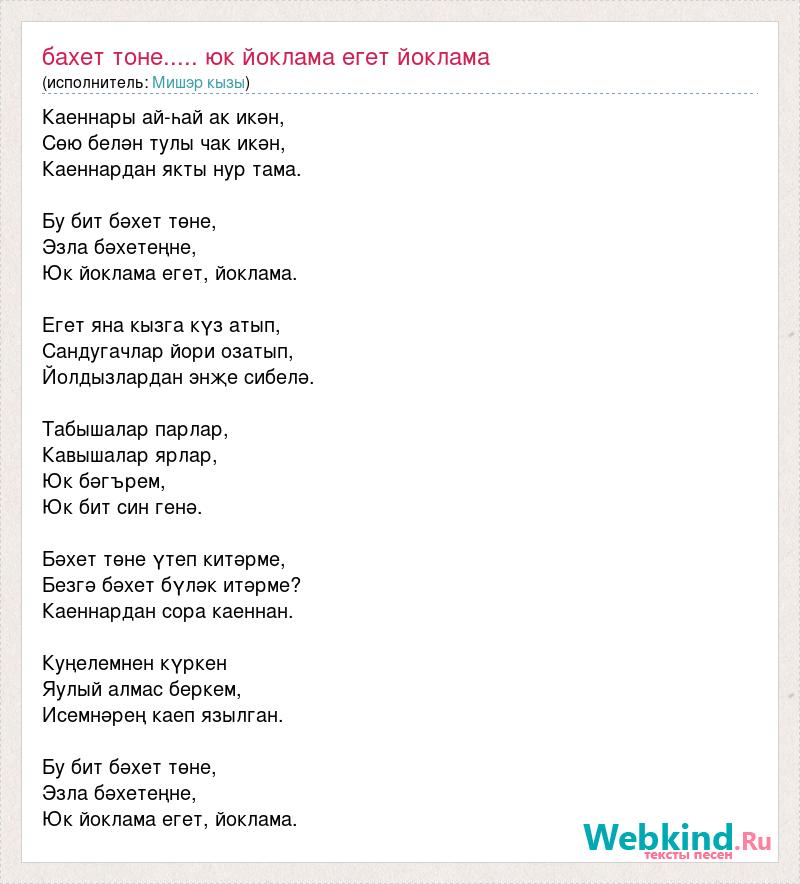 Каеннары ай-һай ак икән, Cөю белән тулы чак икән, Каеннардан якты нур тама. Бу бит бәхет төне, Эзла бәхетеңне, Юк йоклама егет, йоклама. Егет яна кызга күз атып, Сандугачлар йори озатып, Йолдызлардан энҗе сибелә. Табышалар парлар, Кавышалар ярлар, Юк бәгърем, Юк бит син генә. Бәхет төне үтеп китәрме, Безгә бәхет бүләк итәрме? Каеннардан сора каеннан. Куңелемнен күркен Яулый алмас беркем, Исемнәрең каеп язылган. Бу бит бәхет төне, Эзла бәхетеңне, Юк йоклама егет, йоклама.