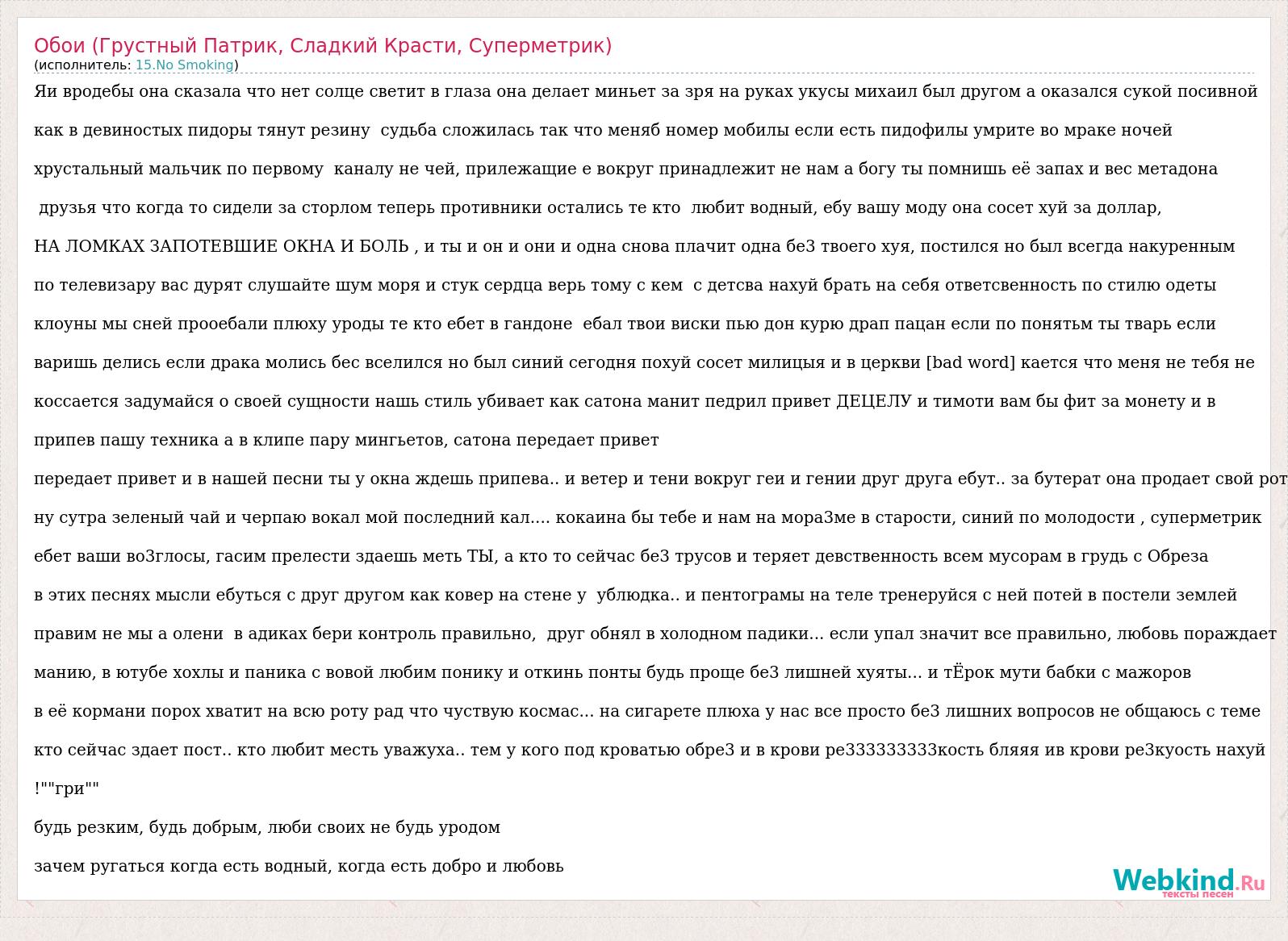 Яи вродебы она сказала что нет солце светит в глаза она делает миньет за зря на руках укусы михаил был другом а оказался сукой посивной как в девиностых пидоры тянут резину судьба сложилась так что меняб номер мобилы если есть пидофилы умрите во мраке ночей хрустальный мальчик по первому каналу не чей, прилежащие е вокруг принадлежит не нам а богу ты помнишь её запах и вес метадона друзья что когда то сидели за сторлом теперь противники остались те кто любит водный, ебу вашу моду она сосет хуй за доллар, НА ЛОМКАХ ЗАПОТЕВШИЕ ОКНА И БОЛЬ , и ты и он и они и одна снова плачит одна бе3 твоего хуя, постился но был всегда накуренным по телевизару вас дурят слушайте шум моря и стук сердца верь тому с кем с детсва нахуй брать на себя ответсвенность по стилю одеты клоуны мы сней прооебали плюху уроды те кто ебет в гандоне ебал твои виски пью дон курю драп пацан если по понятьм ты тварь если варишь делись если драка молись бес вселился но был синий сегодня похуй сосет милицыя и в церкви [bad word] кается что меня не тебя не коссается задумайся о своей сущности нашь стиль убивает как сатона манит педрил привет ДЕЦЕЛУ и тимоти вам бы фит за монету и в припев пашу техника а в клипе пару мингьетов, сатона передает привет передает привет и в нашей песни ты у окна ждешь припева.. и ветер и тени вокруг геи и гении друг друга ебут.. за бутерат она продает свой рот ну сутра зеленый чай и черпаю вокал мой последний кал.... кокаина бы тебе и нам на мора3ме в старости, синий по молодости , суперметрик ебет ваши во3глосы, гасим прелести здаешь меть ТЫ, а кто то сейчас бе3 трусов и теряет девственность всем мусорам в грудь с Обреза в этих песнях мысли ебуться с друг другом как ковер на стене у ублюдка.. и пентограмы на теле тренеруйся с ней потей в постели землей правим не мы а олени в адиках бери контроль правильно, друг обнял в холодном падики... если упал значит все правильно, любовь пораждает манию, в ютубе хохлы и паника с вовой любим понику и откинь понты будь проще бе3 лишней хуяты... и тЁрок мути бабки с мажоров в её кормани порох хватит на всю роту рад что чуствую космас... на сигарете плюха у нас все просто бе3 лишних вопросов не общаюсь с теме кто сейчас здает пост.. кто любит месть уважуха.. тем у кого под кроватью обре3 и в крови ре333333333кость бляяя ив крови ре3куость нахуй !""гри"" будь резким, будь добрым, люби своих не будь уродом зачем ругаться когда есть водный, когда есть добро и любовь