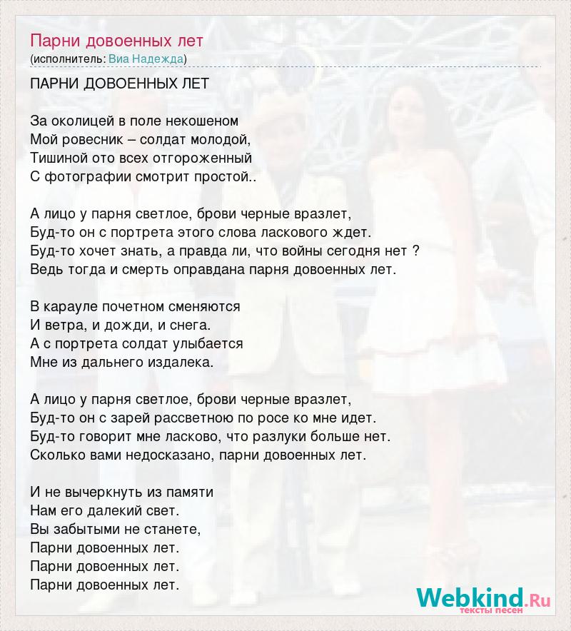 ПАРНИ ДОВОЕННЫХ ЛЕТ За околицей в поле некошеном Мой ровесник – солдат молодой, Тишиной ото всех отгороженный С фотографии смотрит простой.. А лицо у парня светлое, брови черные вразлет, Буд-то он с портрета этого слова ласкового ждет. Буд-то хочет знать, а правда ли, что войны сегодня нет ? Ведь тогда и смерть оправдана парня довоенных лет. В карауле почетном сменяются И ветра, и дожди, и снега. А с портрета солдат улыбается Мне из дальнего издалека. А лицо у парня светлое, брови черные вразлет, Буд-то он с зарей рассветною по росе ко мне идет. Буд-то говорит мне ласково, что разлуки больше нет. Сколько вами недосказано, парни довоенных лет. И не вычеркнуть из памяти Нам его далекий свет. Вы забытыми не станете, Парни довоенных лет. Парни довоенных лет. Парни довоенных лет.