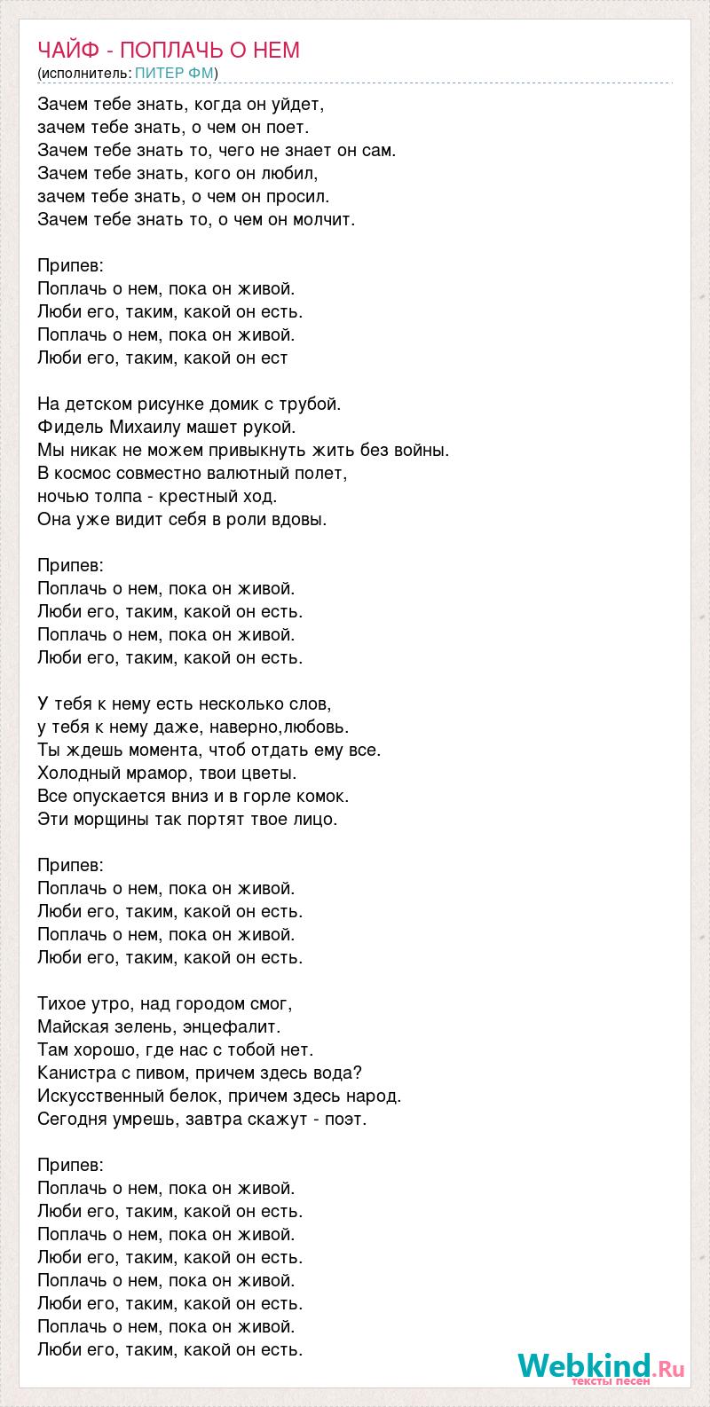 Зачем тебе знать, когда он уйдет, зачем тебе знать, о чем он поет. Зачем тебе знать то, чего не знает он сам. Зачем тебе знать, кого он любил, зачем тебе знать, о чем он просил. Зачем тебе знать то, о чем он молчит. Припев: Поплачь о нем, пока он живой. Люби его, таким, какой он есть. Поплачь о нем, пока он живой. Люби его, таким, какой он ест На детском рисунке домик с трубой. Фидель Михаилу машет рукой. Мы никак не можем привыкнуть жить без войны. В космос совместно валютный полет, ночью толпа - крестный ход. Она уже видит себя в роли вдовы. Припев: Поплачь о нем, пока он живой. Люби его, таким, какой он есть. Поплачь о нем, пока он живой. Люби его, таким, какой он есть. У тебя к нему есть несколько слов, у тебя к нему даже, наверно,любовь. Ты ждешь момента, чтоб отдать ему все. Холодный мрамор, твои цветы. Все опускается вниз и в горле комок. Эти морщины так портят твое лицо. Припев: Поплачь о нем, пока он живой. Люби его, таким, какой он есть. Поплачь о нем, пока он живой. Люби его, таким, какой он есть. Тихое утро, над городом смог, Майская зелень, энцефалит. Там хорошо, где нас с тобой нет. Канистра с пивом, причем здесь вода? Искусственный белок, причем здесь народ. Сегодня умрешь, завтра скажут - поэт. Припев: Поплачь о нем, пока он живой. Люби его, таким, какой он есть. Поплачь о нем, пока он живой. Люби его, таким, какой он есть. Поплачь о нем, пока он живой. Люби его, таким, какой он есть. Поплачь о нем, пока он живой. Люби его, таким, какой он есть.