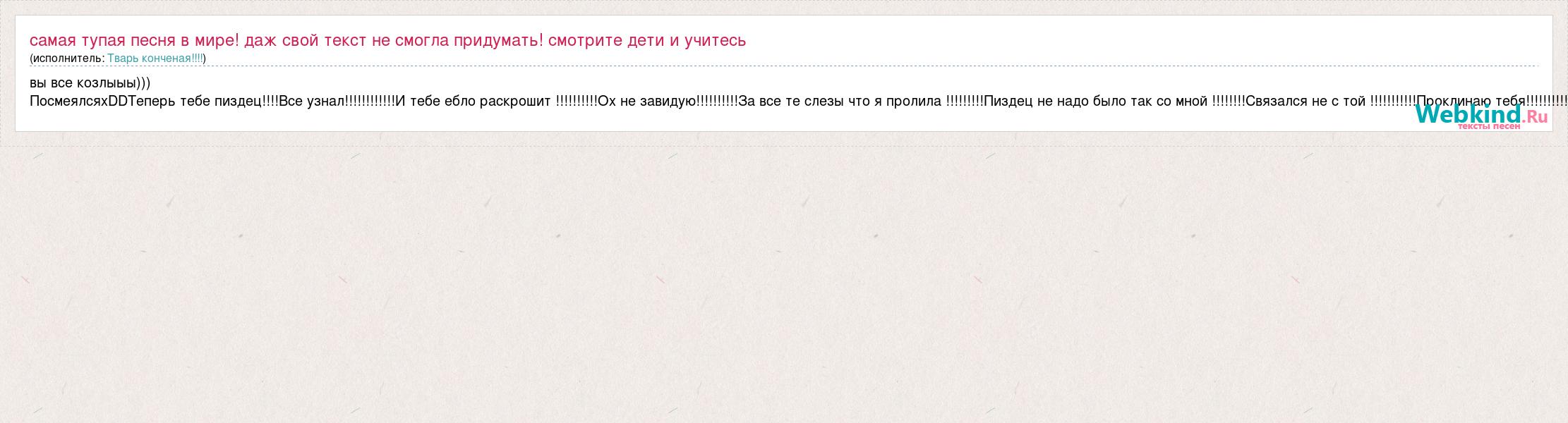 Главная→Исполнители→Тварь конченая!!!!→Самая тупая песня в мире! даж свой текст не смогла придумать! смотрите д