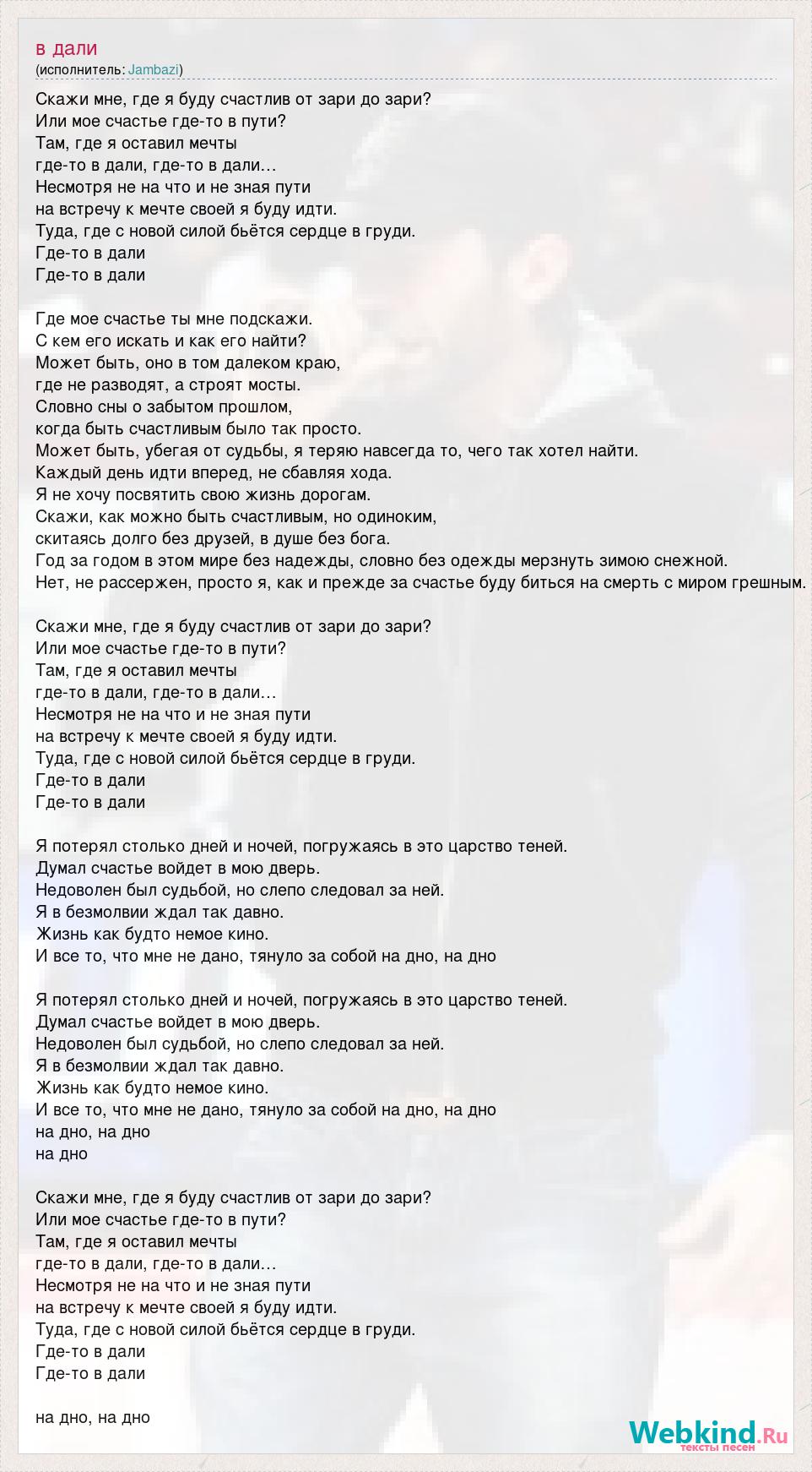 Скажи мне, где я буду счастлив от зари до зари? Или мое счастье где-то в пути? Там, где я оставил мечты где-то в дали, где-то в дали… Несмотря не на что и не зная пути на встречу к мечте своей я буду идти. Туда, где с новой силой бьётся сердце в груди. Где-то в дали Где-то в дали Где мое счастье ты мне подскажи. С кем его искать и как его найти? Может быть, оно в том далеком краю, где не разводят, а строят мосты. Словно сны о забытом прошлом, когда быть счастливым было так просто. Может быть, убегая от судьбы, я теряю навсегда то, чего так хотел найти. Каждый день идти вперед, не сбавляя хода. Я не хочу посвятить свою жизнь дорогам. Скажи, как можно быть счастливым, но одиноким, скитаясь долго без друзей, в душе без бога. Год за годом в этом мире без надежды, словно без одежды мерзнуть зимою снежной. Нет, не рассержен, просто я, как и прежде за счастье буду биться на смерть с миром грешным. Скажи мне, где я буду счастлив от зари до зари? Или мое счастье где-то в пути? Там, где я оставил мечты где-то в дали, где-то в дали… Несмотря не на что и не зная пути на встречу к мечте своей я буду идти. Туда, где с новой силой бьётся сердце в груди. Где-то в дали Где-то в дали Я потерял столько дней и ночей, погружаясь в это царство теней. Думал счастье войдет в мою дверь. Недоволен был судьбой, но слепо следовал за ней. Я в безмолвии ждал так давно. Жизнь как будто немое кино. И все то, что мне не дано, тянуло за собой на дно, на дно Я потерял столько дней и ночей, погружаясь в это царство теней. Думал счастье войдет в мою дверь. Недоволен был судьбой, но слепо следовал за ней. Я в безмолвии ждал так давно. Жизнь как будто немое кино. И все то, что мне не дано, тянуло за собой на дно, на дно на дно, на дно на дно Скажи мне, где я буду счастлив от зари до зари? Или мое счастье где-то в пути? Там, где я оставил мечты где-то в дали, где-то в дали… Несмотря не на что и не зная пути на встречу к мечте своей я буду идти. Туда, где с новой силой бьётся сердце в груди. Где-то в дали Где-то в дали на дно, на дно