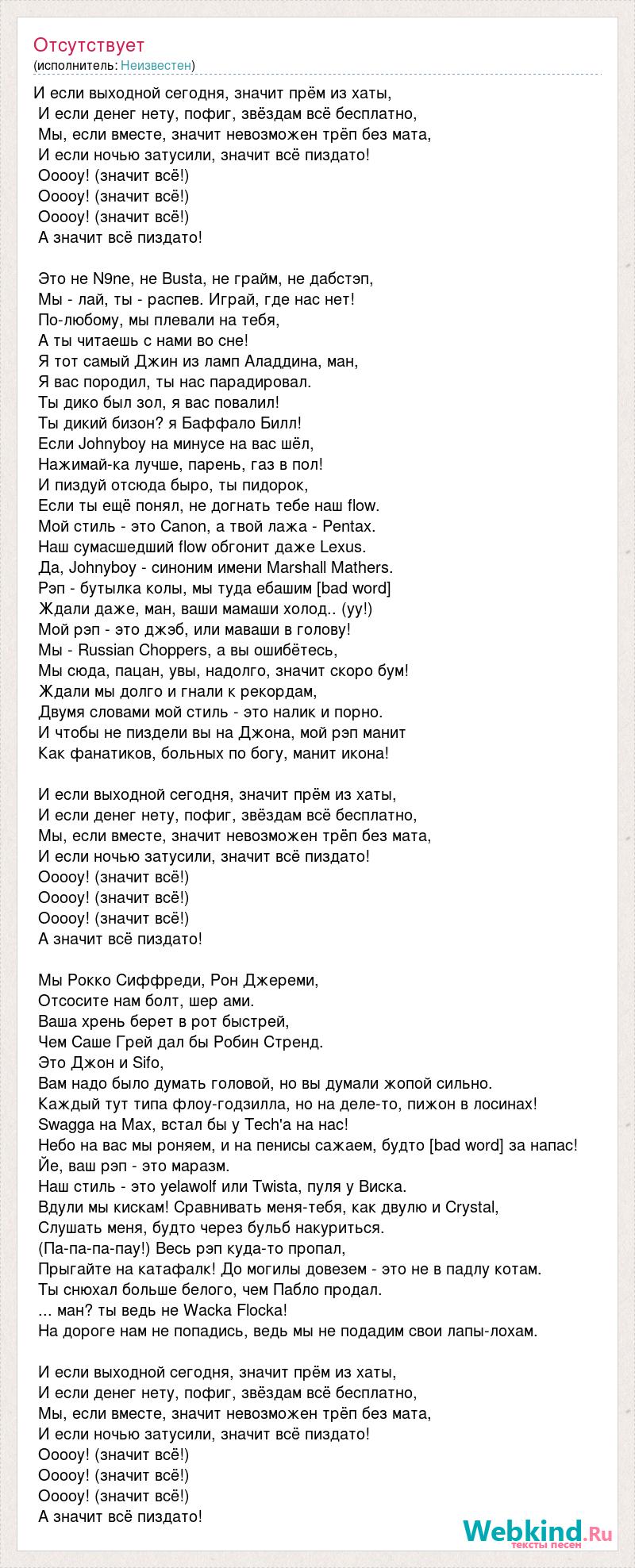 И если выходной сегодня, значит прём из хаты, И если денег нету, пофиг, звёздам всё бесплатно, Мы, если вместе, значит невозможен трёп без мата, И если ночью затусили, значит всё пиздато! Ооооу! (значит всё!) Ооооу! (значит всё!) Ооооу! (значит всё!) А значит всё пиздато! Это не N9ne, не Busta, не грайм, не дабстэп, Мы - лай, ты - распев. Играй, где нас нет! По-любому, мы плевали на тебя, А ты читаешь с нами во сне! Я тот самый Джин из ламп Аладдина, ман, Я вас породил, ты нас парадировал. Ты дико был зол, я вас повалил! Ты дикий бизон? я Баффало Билл! Если Johnyboy на минусе на вас шёл, Нажимай-ка лучше, парень, газ в пол! И пиздуй отсюда быро, ты пидорок, Если ты ещё понял, не догнать тебе наш flow. Мой стиль - это Canon, а твой лажа - Pentax. Наш сумасшедший flow обгонит даже Lexus. Да, Johnyboy - синоним имени Marshall Mathers. Рэп - бутылка колы, мы туда ебашим [bad word] Ждали даже, ман, ваши мамаши холод.. (уу!) Мой рэп - это джэб, или маваши в голову! Мы - Russian Choppers, а вы ошибётесь, Мы сюда, пацан, увы, надолго, значит скоро бум! Ждали мы долго и гнали к рекордам, Двумя словами мой стиль - это налик и порно. И чтобы не пиздели вы на Джона, мой рэп манит Как фанатиков, больных по богу, манит икона! И если выходной сегодня, значит прём из хаты, И если денег нету, пофиг, звёздам всё бесплатно, Мы, если вместе, значит невозможен трёп без мата, И если ночью затусили, значит всё пиздато! Ооооу! (значит всё!) Ооооу! (значит всё!) Ооооу! (значит всё!) А значит всё пиздато! Мы Рокко Сиффреди, Рон Джереми, Отсосите нам болт, шер ами. Ваша хрень берет в рот быстрей, Чем Саше Грей дал бы Робин Стренд. Это Джон и Sifo, Вам надо было думать головой, но вы думали жопой сильно. Каждый тут типа флоу-годзилла, но на деле-то, пижон в лосинах! Swagga на Max, встал бы у Tech'a на нас! Небо на вас мы роняем, и на пенисы сажаем, будто [bad word] за напас! Йе, ваш рэп - это маразм. Наш стиль - это yelawolf или Twista, пуля у Виска. Вдули мы кискам! Сравнивать меня-тебя, как двулю и Crystal, Слушать меня, будто через бульб накуриться. (Па-па-па-пау!) Весь рэп куда-то пропал, Прыгайте на катафалк! До могилы довезем - это не в падлу котам. Ты снюхал больше белого, чем Пабло продал. ... ман? ты ведь не Wacka Flocka! На дороге нам не попадись, ведь мы не подадим свои лапы-лохам. И если выходной сегодня, значит прём из хаты, И если денег нету, пофиг, звёздам всё бесплатно, Мы, если вместе, значит невозможен трёп без мата, И если ночью затусили, значит всё пиздато! Ооооу! (значит всё!) Ооооу! (значит всё!) Ооооу! (значит всё!) А значит всё пиздато!