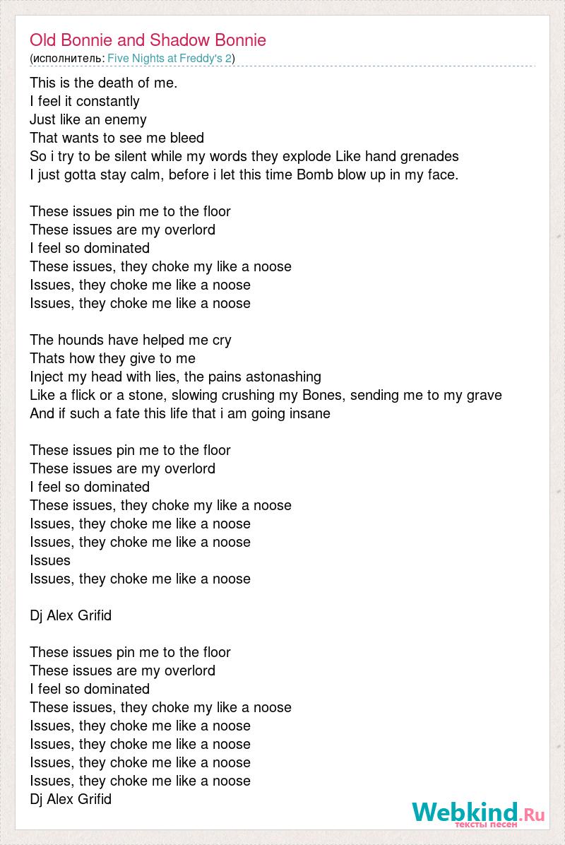 This is the death of me. I feel it constantly Just like an enemy That wants to see me bleed So i try to be silent while my words they explode Like hand grenades I just gotta stay calm, before i let this time Bomb blow up in my face. These issues pin me to the floor These issues are my overlord I feel so dominated These issues, they choke my like a noose Issues, they choke me like a noose Issues, they choke me like a noose The hounds have helped me cry Thats how they give to me Inject my head with lies, the pains astonashing Like a flick or a stone, slowing crushing my Bones, sending me to my grave And if such a fate this life that i am going insane These issues pin me to the floor These issues are my overlord I feel so dominated These issues, they choke my like a noose Issues, they choke me like a noose Issues, they choke me like a noose Issues Issues, they choke me like a noose Dj Alex Grifid These issues pin me to the floor These issues are my overlord I feel so dominated These issues, they choke my like a noose Issues, they choke me like a noose Issues, they choke me like a noose Issues, they choke me like a noose Issues, they choke me like a noose Dj Alex Grifid