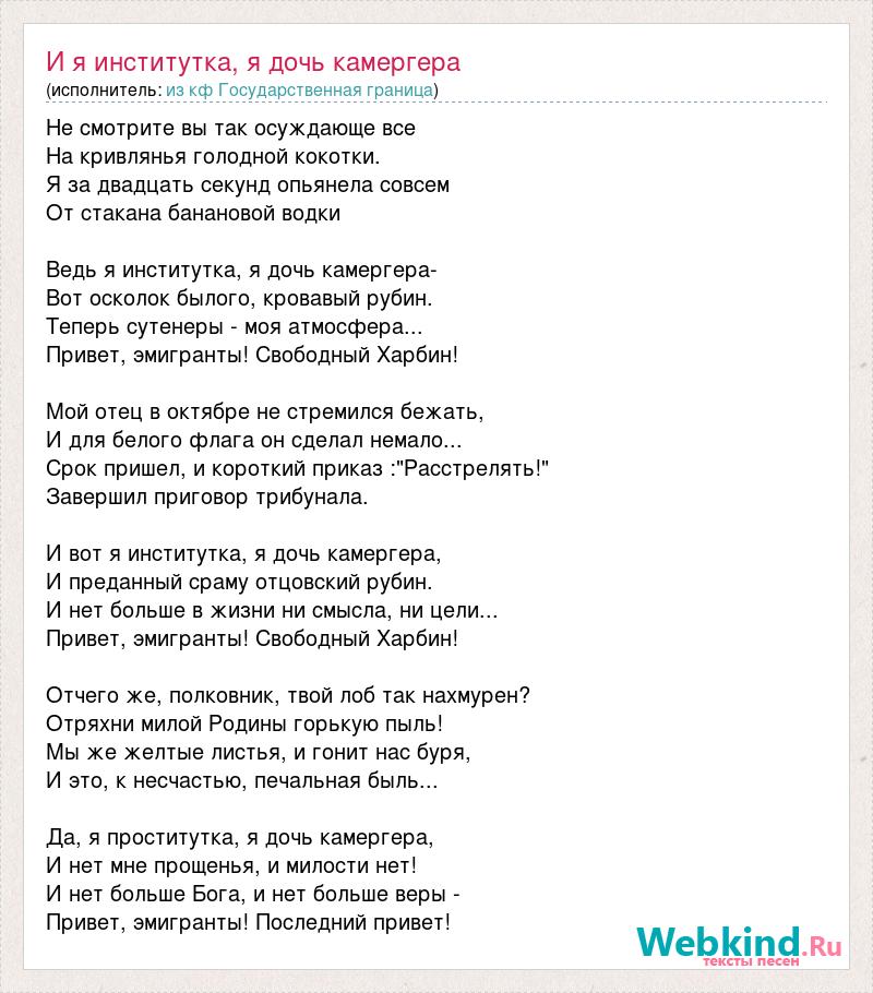 Не смотрите вы так осуждающе все На кривлянья голодной кокотки. Я за двадцать секунд опьянела совсем От стакана банановой водки Ведь я институтка, я дочь камергера- Вот осколок былого, кровавый рубин. Теперь сутенеры - моя атмосфера... Привет, эмигранты! Свободный Харбин! Мой отец в октябре не стремился бежать, И для белого флага он сделал немало... Срок пришел, и короткий приказ :"Расстрелять!" Завершил приговор трибунала. И вот я институтка, я дочь камергера, И преданный сраму отцовский рубин. И нет больше в жизни ни смысла, ни цели... Привет, эмигранты! Свободный Харбин! Отчего же, полковник, твой лоб так нахмурен? Отряхни милой Родины горькую пыль! Мы же желтые листья, и гонит нас буря, И это, к несчастью, печальная быль... Да, я проститутка, я дочь камергера, И нет мне прощенья, и милости нет! И нет больше Бога, и нет больше веры - Привет, эмигранты! Последний привет!