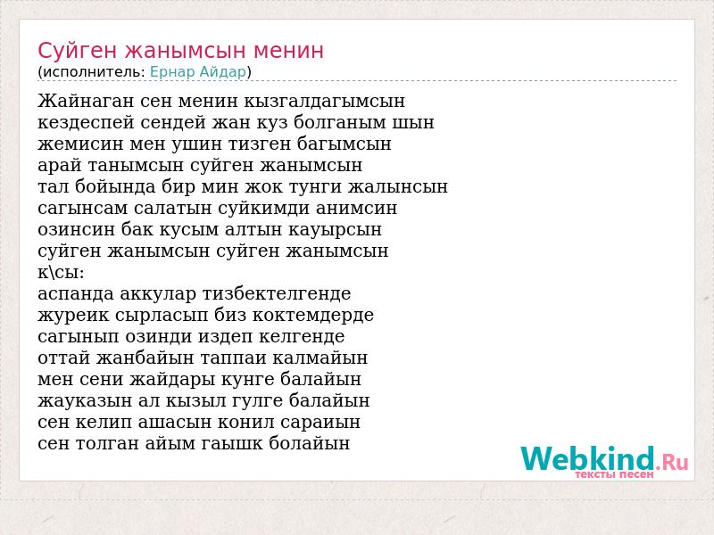 Жайнаган сен менин кызгалдагымсын кездеспей сендей жан куз болганым шын жемисин мен ушин тизген багымсын арай танымсын суйген жанымсын тал бойында бир мин жок тунги жалынсын сагынсам салатын суйкимди анимсин озинсин бак кусым алтын кауырсын суйген жанымсын суйген жанымсын к\сы: аспанда аккулар тизбектелгенде журеик сырласып биз коктемдерде сагынып озинди издеп келгенде оттай жанбайын таппаи калмайын мен сени жайдары кунге балайын жауказын ал кызыл гулге балайын сен келип ашасын конил сараиын сен толган айым гаышк болайын