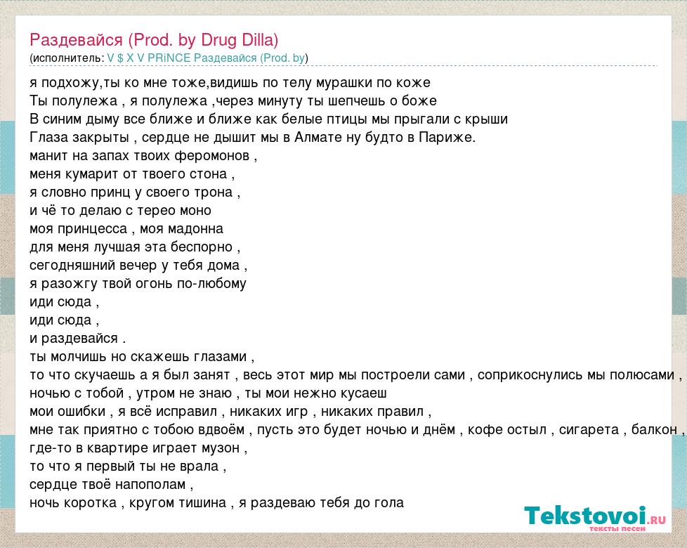 я подхожу,ты ко мне тоже,видишь по телу мурашки по коже Ты полулежа , я полулежа ,через минуту ты шепчешь о боже В синим дыму все ближе и ближе как белые птицы мы прыгали с крыши Глаза закрыты , сердце не дышит мы в Алмате ну будто в Париже. манит на запах твоих феромонов , меня кумарит от твоего стона , я словно принц у своего трона , и чё то делаю с терео моно моя принцесса , моя мадонна для меня лучшая эта беспорно , сегодняшний вечер у тебя дома , я разожгу твой огонь по-любому иди сюда , иди сюда , и раздевайся . ты молчишь но скажешь глазами , то что скучаешь а я был занят , весь этот мир мы построели сами , соприкоснулись мы полюсами , ночью с тобой , утром не знаю , ты мои нежно кусаеш мои ошибки , я всё исправил , никаких игр , никаких правил , мне так приятно с тобою вдвоём , пусть это будет ночью и днём , кофе остыл , сигарета , балкон , где-то в квартире играет музон , то что я первый ты не врала , сердце твоё напополам , ночь коротка , кругом тишина , я раздеваю тебя до гола