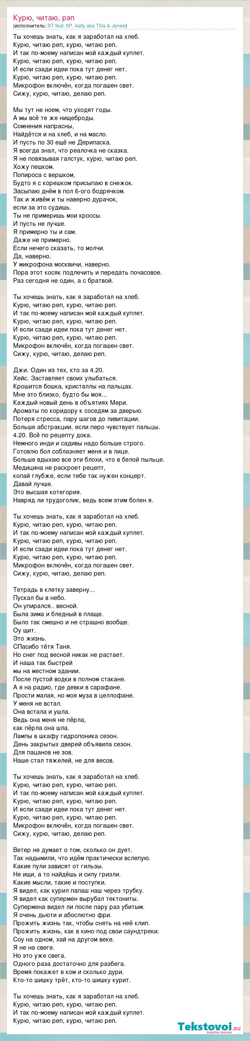 Ты хочешь знать, как я заработал на хлеб. Курю, читаю реп, курю, читаю реп. И так по-моему написан мой каждый куплет. Курю, читаю реп, курю, читаю реп. И если сзади идеи пока тут денег нет. Курю, читаю реп, курю, читаю реп. Микрофон включён, когда погашен свет. Сижу, курю, читаю, делаю реп. Мы тут не ноем, что уходят годы. А мы всё те же нищеброды. Сомнения напрасны, Найдётся и на хлеб, и на масло. И пусть по 30 ещё не Дерипаска. Я всегда знал, что реалочка не сказка. Я не повязывая галстук, курю, читаю реп. Хожу пешком. Попироса с вершком, Будто я с корешком присыпаю в снежок. Засыпаю днём в пол 6-ого бодрячком. Так и живём и ты наверно дурачок, если за это судишь. Ты не примеришь мои кроссы. И пусть не лучше. Я примерно ты и сам. Даже не примерно. Если нечего сказать, то молчи. Да, наверно. У микрофона москвичи, наверно. Пора этот косяк подлечить и передать почасовое. Раз сегодня не один, а с братвой. Ты хочешь знать, как я заработал на хлеб. Курю, читаю реп, курю, читаю реп. И так по-моему написан мой каждый куплет. Курю, читаю реп, курю, читаю реп. И если сзади идеи пока тут денег нет. Курю, читаю реп, курю, читаю реп. Микрофон включён, когда погашен свет. Сижу, курю, читаю, делаю реп. Джи. Один из тех, кто за 4.20. Хейс. Заставляет своих улыбаться. Крошится бошка, кристаллы на пальцах. Мне это близко, будто бы моя... Каждый новый день в объятиях Мери. Ароматы по коридору к соседям за дверью. Потеря стресса, пару шагов до ливитации. Больше абстракции, если перо чувствует пальцы. 4.20. Всё по рецепту дока. Немного инди и садивы надо больше строго. Готовлю бол соблазняет меня и в лице. Больше вдыхаю все эти блохи, что в белой пыльце. Медицина не раскроет рецепт, копай глубже, если тебе так нужен концерт. Давай лучше. Это высшая котегория. Навряд ли трудоголик, ведь всем этим болен я. Ты хочешь знать, как я заработал на хлеб. Курю, читаю реп, курю, читаю реп. И так по-моему написан мой каждый куплет. Курю, читаю реп, курю, читаю реп. И если сзади идеи пока тут денег нет. Курю, читаю реп, курю, читаю реп. Микрофон включён, когда погашен свет. Сижу, курю, читаю, делаю реп. Тетрадь в клетку заверну... Пускал бы в небо. Он упирался.. весной. Была зима и бледный в плаще. Было так смешно и не страшно вообще. Оу щит. Это жизнь. СПасибо тётя Таня. Но снег под весной никак не растает. И наша так быстрей мы на местном здании. После пустой водки в полном стакане. А я на радио, где девки в сарафане. Прости малая, но моя муза в целлофане. У меня не встал. Она встала и ушла. Ведь она меня не пёрла, как пёрла она шла. Лампы в шкафу гидропоника сезон. День закрытых дверей объявила сезон. Для пацанов не зов. Наше стал тяжелей, не для весов. Ты хочешь знать, как я заработал на хлеб. Курю, читаю реп, курю, читаю реп. И так по-моему написан мой каждый куплет. Курю, читаю реп, курю, читаю реп. И если сзади идеи пока тут денег нет. Курю, читаю реп, курю, читаю реп. Микрофон включён, когда погашен свет. Сижу, курю, читаю, делаю реп. Ветер не думает о том, сколько он дует. Так надымили, что идём практически вслепую. Какие пули зависят от гильзы. Не ищи, а то найдёшь и силу гризли. Какие мысли, такие и поступки. Я видел, как курил папаш наш через трубку. Я видел как супермен вырубал тектониты. Супермена видел ли после пару раз убитым. Я очень дьюти и абослютно фри. Прожить жизнь так, чтобы снять на неё клип. Прожить жизнь, как в кино под свои саундтреки. Соу на одно