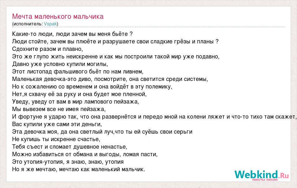 Какие-то люди, люди зачем вы меня бьёте ? Люди стойте, зачем вы плюёте и разрушаете свои сладкие грёзы и планы ? Сдохните разом и плавно, Это же глупо жить неискренне и как мы построили такой мир уже подавно, Давно уже условно купили могилы, Этот листопад фальшивого бьёт по нам ливнем, Маленькая девочка-это диво, посмотрите, она светится среди системы, Но к сожалению со временем и она войдёт в эту полемику, Нет,я схвачу её за руку и она будет мое пленной, Уведу, уведу от вам в мир лампового пейзажа, Мы вывезем все не имея пейзажа, И фортуне я ударю так, что она развернётся и передо мной на колени ляжет и что-то тихо там скажет, Вас купили уже сами эти деньги, Эта девочка моя, да она светлый луч,что ты ей суёшь свои серьги Не купишь ты искренне счастье, Тебя съест и сломает душевное ненастье, Можно избавиться от обмана и выгоды, ломая пасти, Это утопия-утопия, я знаю, знаю, утопия Но я же мечтаю, мечтаю как маленький мальчик.
