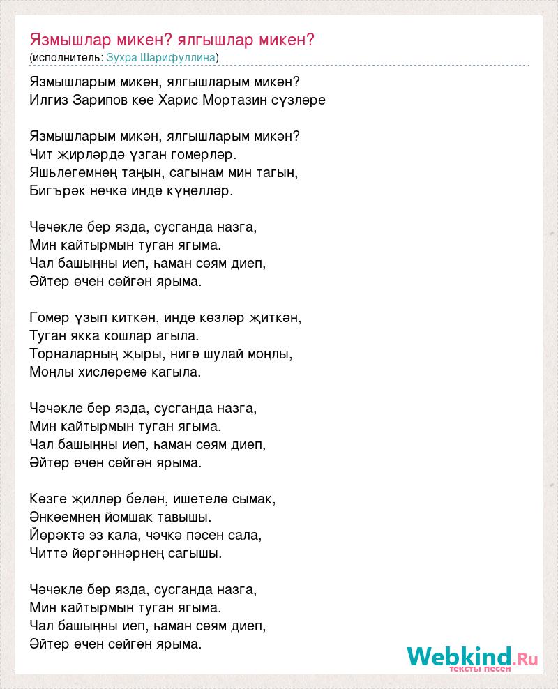 Язмышларым микән, ялгышларым микән? Илгиз Зарипов көе Харис Мортазин сүзләре Язмышларым микән, ялгышларым микән? Чит җирләрдә үзган гомерләр. Яшьлегемнең таңын, сагынам мин тагын, Бигърәк нечкә инде күңелләр. Чәчәкле бер язда, сусганда назга, Мин кайтырмын туган ягыма. Чал башыңны иеп, һаман сөям диеп, Әйтер өчен сөйгән ярыма. Гомер үзып киткән, инде көзләр җиткән, Туган якка кошлар агыла. Торналарның җыры, нигә шулай моңлы, Моңлы хисләремә кагыла. Чәчәкле бер язда, сусганда назга, Мин кайтырмын туган ягыма. Чал башыңны иеп, һаман сөям диеп, Әйтер өчен сөйгән ярыма. Көзге җилләр белән, ишетелә сымак, Әнкәемнең йомшак тавышы. Йөрәктә эз кала, чәчкә пәсен сала, Читтә йөргәннәрнең сагышы. Чәчәкле бер язда, сусганда назга, Мин кайтырмын туган ягыма. Чал башыңны иеп, һаман сөям диеп, Әйтер өчен сөйгән ярыма.
