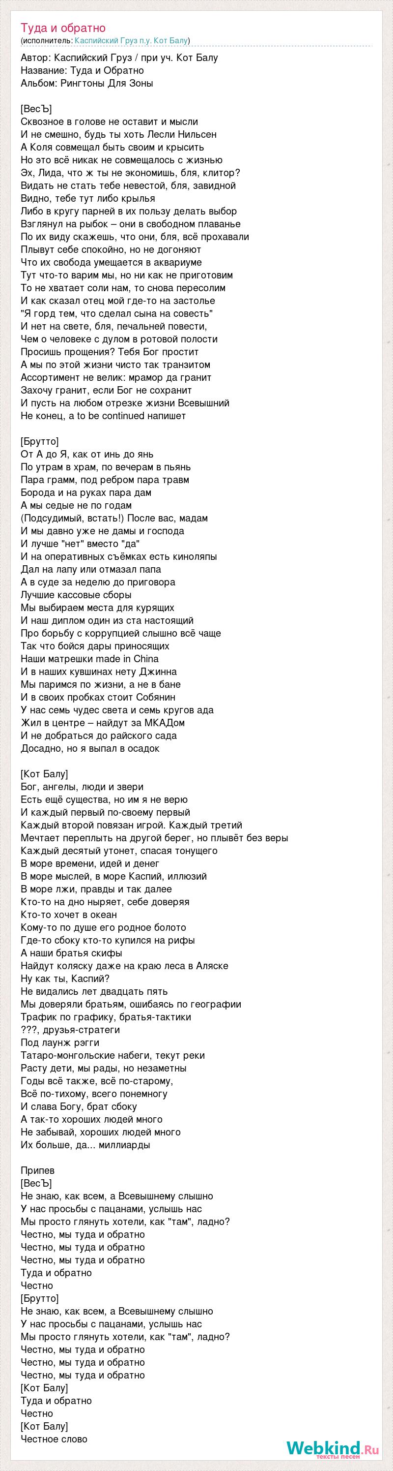 Автор: Каспийский Груз / при уч. Кот Балу Название: Туда и Обратно Альбом: Рингтоны Для Зоны [ВесЪ] Сквозное в голове не оставит и мысли И не смешно, будь ты хоть Лесли Нильсен А Коля совмещал быть своим и крысить Но это всё никак не совмещалось с жизнью Эх, Лида, что ж ты не экономишь, бля, клитор? Видать не стать тебе невестой, бля, завидной Видно, тебе тут либо крылья Либо в кругу парней в их пользу делать выбор Взглянул на рыбок – они в свободном плаванье По их виду скажешь, что они, бля, всё прохавали Плывут себе спокойно, но не догоняют Что их свобода умещается в аквариуме Тут что-то варим мы, но ни как не приготовим То не хватает соли нам, то снова пересолим И как сказал отец мой где-то на застолье "Я горд тем, что сделал сына на совесть" И нет на свете, бля, печальней повести, Чем о человеке с дулом в ротовой полости Просишь прощения? Тебя Бог простит А мы по этой жизни чисто так транзитом Ассортимент не велик: мрамор да гранит Захочу гранит, если Бог не сохранит И пусть на любом отрезке жизни Всевышний Не конец, а to be continued напишет [Брутто] От А до Я, как от инь до янь По утрам в храм, по вечерам в пьянь Пара грамм, под ребром пара травм Борода и на руках пара дам А мы седые не по годам (Подсудимый, встать!) После вас, мадам И мы давно уже не дамы и господа И лучше "нет" вместо "да" И на оперативных съёмках есть киноляпы Дал на лапу или отмазал папа А в суде за неделю до приговора Лучшие кассовые сборы Мы выбираем места для курящих И наш диплом один из ста настоящий Про борьбу с коррупцией слышно всё чаще Так что бойся дары приносящих Наши матрешки made in China И в наших кувшинах нету Джинна Мы паримся по жизни, а не в бане И в своих пробках стоит Собянин У нас семь чудес света и семь кругов ада Жил в центре – найдут за МКАДом И не добраться до райского сада Досадно, но я выпал в осадок [Кот Балу] Бог, ангелы, люди и звери Есть ещё существа, но им я не верю И каждый первый по-своему первый Каждый второй повязан игрой. Каждый третий Мечтает переплыть на другой берег, но плывёт без веры Каждый десятый утонет, спасая тонущего В море времени, идей и денег В море мыслей, в море Каспий, иллюзий В море лжи, правды и так далее Кто-то на дно ныряет, себе доверяя Кто-то хочет в океан Кому-то по душе его родное болото Где-то сбоку кто-то купился на рифы А наши братья скифы Найдут коляску даже на краю леса в Аляске Ну как ты, Каспий? Не видались лет двадцать пять Мы доверяли братьям, ошибаясь по географии Трафик по графику, братья-тактики ???, друзья-стратеги Под лаунж рэгги Татаро-монгольские набеги, текут реки Расту дети, мы рады, но незаметны Годы всё также, всё по-старому, Всё по-тихому, всего понемногу И слава Богу, брат сбоку А так-то хороших людей много Не забывай, хороших людей много Их больше, да... миллиарды Припев [ВесЪ] Не знаю, как всем, а Всевышнему слышно У нас просьбы с пацанами, услышь нас Мы просто глянуть хотели, как "там", ладно? Честно, мы туда и обратно Честно, мы туда и обратно Честно, мы туда и обратно Туда и обратно Честно [Брутто] Не знаю, как всем, а Всевышнему слышно У нас просьбы с пацанами, услышь нас Мы просто глянуть хотели, как "там", ладно? Честно, мы туда и обратно Честно, мы туда и обратно Честно, мы туда и обратно [Кот Балу] Туда и обратно Честно [Кот Балу] Честное слово