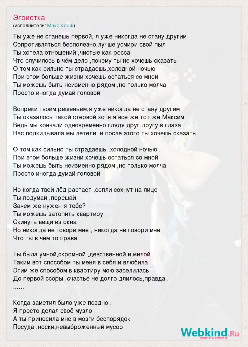 Ты уже не станешь первой, я уже никогда не стану другим Сопротивляться бесполезно,лучше усмири свой пыл Ты хотела отношений ,чистые как росса Что случилось в чём дело ,почему ты не хочешь сказать О том как сильно ты страдаешь,холодной ночью При этом больше жизни хочешь остаться со мной Ты можешь быть неизменно рядом ,но только молча Просто иногда думай головой Вопреки твоим решеньем,я уже никогда не стану другим Ты оказалось такой стервой,хотя я все же тот же Максим Ведь мы кончали одновременно,глядя друг другу в глаза Нас подкидывала мы летели ,и после этого ты хочешь сказать. О том как сильно ты страдаешь ,холодной ночью . При этом больше жизни хочешь остаться со мной Ты можешь быть неизменно рядом ,но только молча Просто иногда думай головой Но когда твой лёд растает ,сопли сохнут на лице Ты подумай ,порешай Зачем же нужен я тебе? Ты можешь затопить квартиру Скинуть вещи из окна Но никогда не говори мне , никогда не говори мне Что ты в чём то права . Ты была умной,скромной ,девственной и милой Таким вот способом ты меня в себя и влюбила Этим же способом в квартиру мою заселилась До первой ссоры ,счастье не долго длилось,правда . ...... Когда заметил было уже поздно . Я просто делал своё музло А ты приносила мне в мозги беспорядок Посуда ,носки,невыброженный мусор