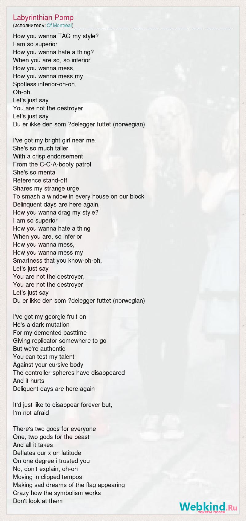 How you wanna TAG my style? I am so superior How you wanna hate a thing? When you are so, so inferior How you wanna mess, How you wanna mess my Spotless interior-oh-oh, Oh-oh Let's just say You are not the destroyer Let's just say Du er ikke den som ?delegger futtet (norwegian) I've got my bright girl near me She's so much taller With a crisp endorsement From the C-C-A-booty patrol She's so mental Reference stand-off Shares my strange urge To smash a window in every house on our block Delinquent days are here again, How you wanna drag my style? I am so superior How you wanna hate a thing When you are, so inferior How you wanna mess, How you wanna mess my Smartness that you know-oh-oh, Let's just say You are not the destroyer, You are not the destroyer Let's just say Du er ikke den som ?delegger futtet (norwegian) I've got my georgie fruit on He's a dark mutation For my demented pasttime Giving replicator somewhere to go But we're authentic You can test my talent Against your cursive body The controller-spheres have disappeared And it hurts Deliquent days are here again It'd just like to disappear forever but, I'm not afraid There's two gods for everyone One, two gods for the beast And all it takes Deflates our x on latitude On one degree i trusted you No, don't explain, oh-oh Moving in clipped tempos Making sad dreams of the flag appearing Crazy how the symbolism works Don't look at them