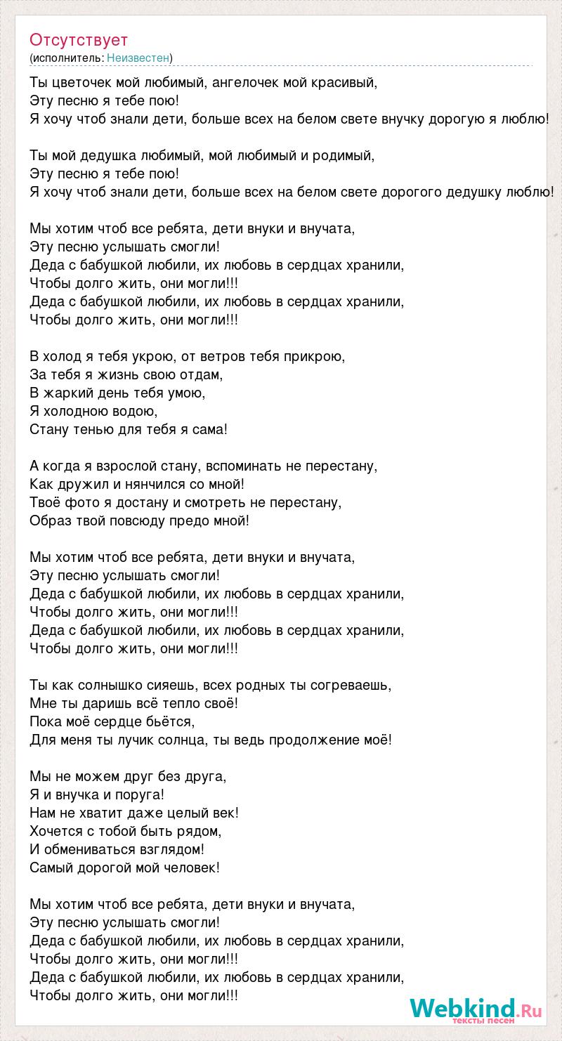Ты цветочек мой любимый, ангелочек мой красивый, Эту песню я тебе пою! Я хочу чтоб знали дети, больше всех на белом свете внучку дорогую я люблю! Ты мой дедушка любимый, мой любимый и родимый, Эту песню я тебе пою! Я хочу чтоб знали дети, больше всех на белом свете дорогого дедушку люблю! Мы хотим чтоб все ребята, дети внуки и внучата, Эту песню услышать смогли! Деда с бабушкой любили, их любовь в сердцах хранили, Чтобы долго жить, они могли!!! Деда с бабушкой любили, их любовь в сердцах хранили, Чтобы долго жить, они могли!!! В холод я тебя укрою, от ветров тебя прикрою, За тебя я жизнь свою отдам, В жаркий день тебя умою, Я холодною водою, Стану тенью для тебя я сама! А когда я взрослой стану, вспоминать не перестану, Как дружил и нянчился со мной! Твоё фото я достану и смотреть не перестану, Образ твой повсюду предо мной! Мы хотим чтоб все ребята, дети внуки и внучата, Эту песню услышать смогли! Деда с бабушкой любили, их любовь в сердцах хранили, Чтобы долго жить, они могли!!! Деда с бабушкой любили, их любовь в сердцах хранили, Чтобы долго жить, они могли!!! Ты как солнышко сияешь, всех родных ты согреваешь, Мне ты даришь всё тепло своё! Пока моё сердце бьётся, Для меня ты лучик солнца, ты ведь продолжение моё! Мы не можем друг без друга, Я и внучка и поруга! Нам не хватит даже целый век! Хочется с тобой быть рядом, И обмениваться взглядом! Самый дорогой мой человек! Мы хотим чтоб все ребята, дети внуки и внучата, Эту песню услышать смогли! Деда с бабушкой любили, их любовь в сердцах хранили, Чтобы долго жить, они могли!!! Деда с бабушкой любили, их любовь в сердцах хранили, Чтобы долго жить, они могли!!!
