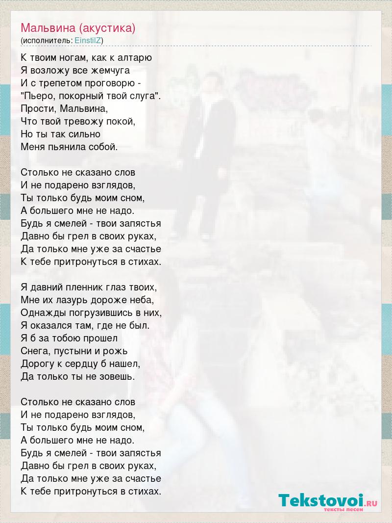 К твоим ногам, как к алтарю Я возложу все жемчуга И с трепетом проговорю - "Пьеро, покорный твой слуга". Прости, Мальвина, Что твой тревожу покой, Но ты так сильно Меня пьянила собой. Столько не сказано слов И не подарено взглядов, Ты только будь моим сном, А большего мне не надо. Будь я смелей - твои запястья Давно бы грел в своих руках, Да только мне уже за счастье К тебе притронуться в стихах. Я давний пленник глаз твоих, Мне их лазурь дороже неба, Однажды погрузившись в них, Я оказался там, где не был. Я б за тобою прошел Снега, пустыни и рожь Дорогу к сердцу б нашел, Да только ты не зовешь. Столько не сказано слов И не подарено взглядов, Ты только будь моим сном, А большего мне не надо. Будь я смелей - твои запястья Давно бы грел в своих руках, Да только мне уже за счастье К тебе притронуться в стихах.