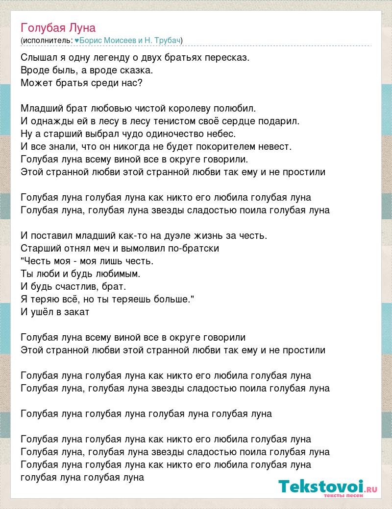 Слышал я одну легенду о двух братьях пересказ. Вроде быль, а вроде сказка. Может братья среди нас? Младший брат любовью чистой королеву полюбил. И однажды ей в лесу в лесу тенистом своё сердце подарил. Ну а старший выбрал чудо одиночество небес. И все знали, что он никогда не будет покорителем невест. Голубая луна всему виной все в округе говорили. Этой странной любви этой странной любви так ему и не простили Голубая луна голубая луна как никто его любила голубая луна Голубая луна, голубая луна звезды сладостью поила голубая луна И поставил младший как-то на дуэле жизнь за честь. Старший отнял меч и вымолвил по-братски "Честь моя - моя лишь честь. Ты люби и будь любимым. И будь счастлив, брат. Я теряю всё, но ты теряешь больше." И ушёл в закат Голубая луна всему виной все в округе говорили Этой странной любви этой странной любви так ему и не простили Голубая луна голубая луна как никто его любила голубая луна Голубая луна, голубая луна звезды сладостью поила голубая луна Голубая луна голубая луна голубая луна голубая луна Голубая луна голубая луна как никто его любила голубая луна Голубая луна, голубая луна звезды сладостью поила голубая луна Голубая луна голубая луна как никто его любила голубая луна голубая луна голубая луна