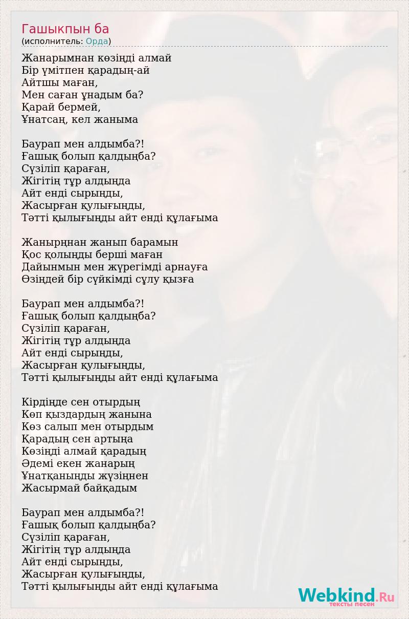 Жанарымнан көзіңді алмай Бір үмітпен қарадың-ай Айтшы маған, Мен саған ұнадым ба? Қарай бермей, Ұнатсаң, кел жаныма Баурап мен алдымба?! Ғашық болып қалдыңба? Сүзіліп қараған, Жігітің тұр алдыңда Айт енді сырыңды, Жасырған қулығыңды, Тәтті қылығыңды айт енді құлағыма Жанырңнан жанып барамын Қос қолыңды берші маған Дайынмын мен жүрегімді арнауға Өзіңдей бір сүйкімді сұлу қызға Баурап мен алдымба?! Ғашық болып қалдыңба? Сүзіліп қараған, Жігітің тұр алдыңда Айт енді сырыңды, Жасырған қулығыңды, Тәтті қылығыңды айт енді құлағыма Кірдіңде сен отырдың Көп қыздардың жанына Көз салып мен отырдым Қарадың сен артыңа Көзіңді алмай қарадың Әдемі екен жанарың Ұнатқаныңды жүзіңнен Жасырмай байқадым Баурап мен алдымба?! Ғашық болып қалдыңба? Сүзіліп қараған, Жігітің тұр алдыңда Айт енді сырыңды, Жасырған қулығыңды, Тәтті қылығыңды айт енді құлағыма