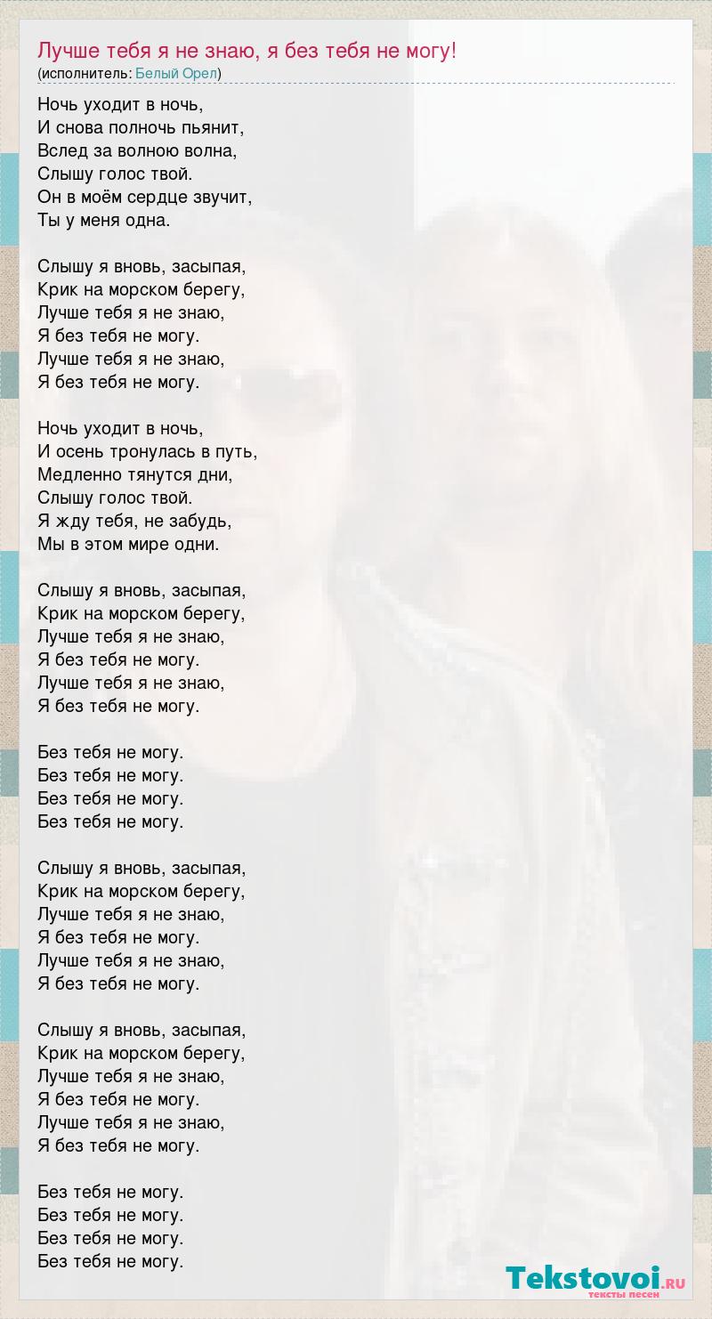 Ночь уходит в ночь, И снова полночь пьянит, Вслед за волною волна, Слышу голос твой. Он в моём сердце звучит, Ты у меня одна. Слышу я вновь, засыпая, Крик на морском берегу, Лучше тебя я не знаю, Я без тебя не могу. Лучше тебя я не знаю, Я без тебя не могу. Ночь уходит в ночь, И осень тронулась в путь, Медленно тянутся дни, Слышу голос твой. Я жду тебя, не забудь, Мы в этом мире одни. Слышу я вновь, засыпая, Крик на морском берегу, Лучше тебя я не знаю, Я без тебя не могу. Лучше тебя я не знаю, Я без тебя не могу. Без тебя не могу. Без тебя не могу. Без тебя не могу. Без тебя не могу. Слышу я вновь, засыпая, Крик на морском берегу, Лучше тебя я не знаю, Я без тебя не могу. Лучше тебя я не знаю, Я без тебя не могу. Слышу я вновь, засыпая, Крик на морском берегу, Лучше тебя я не знаю, Я без тебя не могу. Лучше тебя я не знаю, Я без тебя не могу. Без тебя не могу. Без тебя не могу. Без тебя не могу. Без тебя не могу.