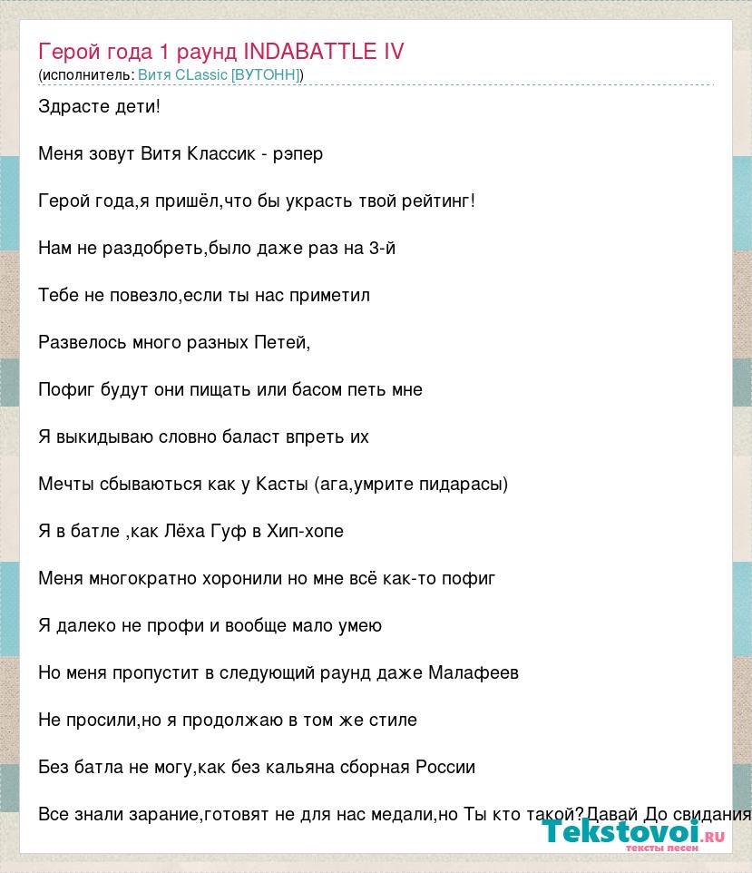 Здрасте дети! Меня зовут Витя Классик - рэпер Герой года,я пришёл,что бы украсть твой рейтинг! Нам не раздобреть,было даже раз на 3-й Тебе не повезло,если ты нас приметил Развелось много разных Петей, Пофиг будут они пищать или басом петь мне Я выкидываю словно баласт впреть их Мечты сбываються как у Касты (ага,умрите пидарасы) Я в батле ,как Лёха Гуф в Хип-хопе Меня многократно хоронили но мне всё как-то пофиг Я далеко не профи и вообще мало умею Но меня пропустит в следующий раунд даже Малафеев Не просили,но я продолжаю в том же стиле Без батла не могу,как без кальяна сборная России Все знали зарание,готовят не для нас медали,но Ты кто такой?Давай До свидания