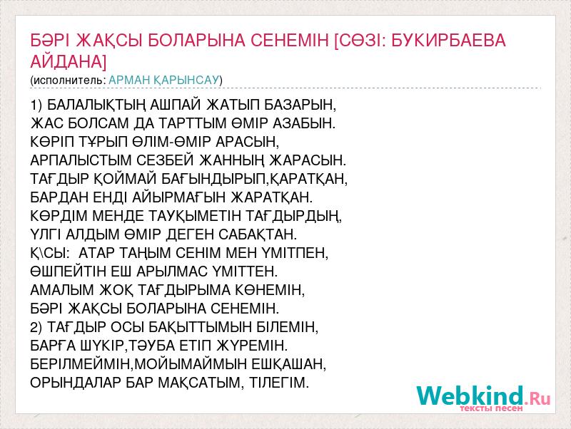 1) БАЛАЛЫҚТЫҢ АШПАЙ ЖАТЫП БАЗАРЫН, ЖАС БОЛСАМ ДА ТАРТТЫМ ӨМІР АЗАБЫН. КӨРІП ТҰРЫП ӨЛІМ-ӨМІР АРАСЫН, АРПАЛЫСТЫМ СЕЗБЕЙ ЖАННЫҢ ЖАРАСЫН. ТАҒДЫР ҚОЙМАЙ БАҒЫНДЫРЫП,ҚАРАТҚАН, БАРДАН ЕНДІ АЙЫРМАҒЫН ЖАРАТҚАН. КӨРДІМ МЕНДЕ ТАУҚЫМЕТІН ТАҒДЫРДЫҢ, ҮЛГІ АЛДЫМ ӨМІР ДЕГЕН САБАҚТАН. Қ\СЫ: АТАР ТАҢЫМ СЕНІМ МЕН ҮМІТПЕН, ӨШПЕЙТІН ЕШ АРЫЛМАС ҮМІТТЕН. АМАЛЫМ ЖОҚ ТАҒДЫРЫМА КӨНЕМІН, БӘРІ ЖАҚСЫ БОЛАРЫНА СЕНЕМІН. 2) ТАҒДЫР ОСЫ БАҚЫТТЫМЫН БІЛЕМІН, БАРҒА ШҮКІР,ТӘУБА ЕТІП ЖҮРЕМІН. БЕРІЛМЕЙМІН,МОЙЫМАЙМЫН ЕШҚАШАН, ОРЫНДАЛАР БАР МАҚСАТЫМ, ТІЛЕГІМ.