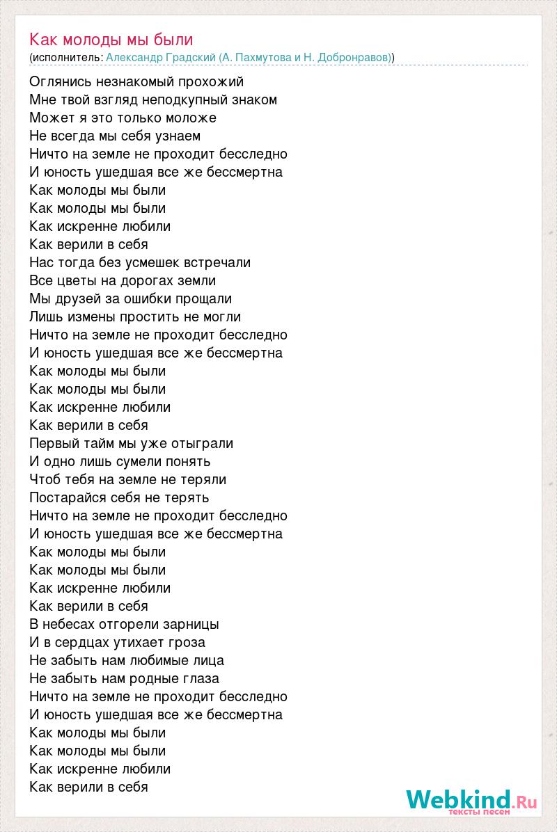 Оглянись незнакомый прохожий Мне твой взгляд неподкупный знаком Может я это только моложе Не всегда мы себя узнаем Ничто на земле не проходит бесследно И юность ушедшая все же бессмертна Как молоды мы были Как молоды мы были Как искренне любили Как верили в себя Нас тогда без усмешек встречали Все цветы на дорогах земли Мы друзей за ошибки прощали Лишь измены простить не могли Ничто на земле не проходит бесследно И юность ушедшая все же бессмертна Как молоды мы были Как молоды мы были Как искренне любили Как верили в себя Первый тайм мы уже отыграли И одно лишь сумели понять Чтоб тебя на земле не теряли Постарайся себя не терять Ничто на земле не проходит бесследно И юность ушедшая все же бессмертна Как молоды мы были Как молоды мы были Как искренне любили Как верили в себя В небесах отгорели зарницы И в сердцах утихает гроза Не забыть нам любимые лица Не забыть нам родные глаза Ничто на земле не проходит бесследно И юность ушедшая все же бессмертна Как молоды мы были Как молоды мы были Как искренне любили Как верили в себя