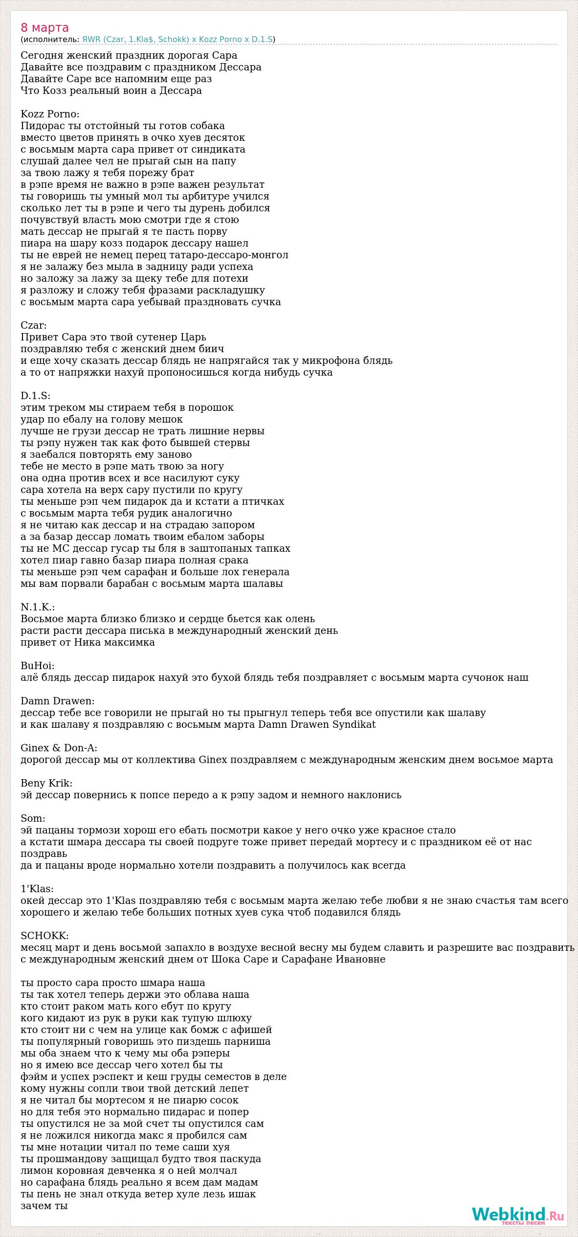 Сегодня женский праздник дорогая Сара Давайте все поздравим с праздником Дессара Давайте Саре все напомним еще раз Что Козз реальный воин а Дессара Kozz Porno: Пидорас ты отстойный ты готов собака вместо цветов принять в очко хуев десяток с восьмым марта сара привет от синдиката слушай далее чел не прыгай сын на папу за твою лажу я тебя порежу брат в рэпе время не важно в рэпе важен результат ты говоришь ты умный мол ты арбитуре учился сколько лет ты в рэпе и чего ты дурень добился почувствуй власть мою смотри где я стою мать дессар не прыгай я те пасть порву пиара на шару козз подарок дессару нашел ты не еврей не немец перец татаро-дессаро-монгол я не залажу без мыла в задницу ради успеха но заложу за лажу за щеку тебе для потехи я разложу и сложу тебя фразами раскладушку с восьмым марта сара уебывай праздновать сучка Czar: Привет Сара это твой сутенер Царь поздравляю тебя с женский днем биич и еще хочу сказать дессар блядь не напрягайся так у микрофона блядь а то от напряжки нахуй пропоносишься когда нибудь сучка D.1.S: этим треком мы стираем тебя в порошок удар по ебалу на голову мешок лучше не грузи дессар не трать лишние нервы ты рэпу нужен так как фото бывшей стервы я заебался повторять ему заново тебе не место в рэпе мать твою за ногу она одна против всех и все насилуют суку сара хотела на верх сару пустили по кругу ты меньше рэп чем пидарок да и кстати а птичках с восьмым марта тебя рудик аналогично я не читаю как дессар и на страдаю запором а за базар дессар ломать твоим ебалом заборы ты не МС дессар гусар ты бля в заштопаных тапках хотел пиар гавно базар пиара полная срака ты меньше рэп чем сарафан и больше лох генерала мы вам порвали барабан с восьмым марта шалавы N.1.K.: Восьмое марта близко близко и сердце бьется как олень расти расти дессара писька в международный женский день привет от Ника максимка BuHoi: алё блядь дессар пидарок нахуй это бухой блядь тебя поздравляет с восьмым марта сучонок наш Damn Drawen: дессар тебе все говорили не прыгай но ты прыгнул теперь тебя все опустили как шалаву и как шалаву я поздравляю с восьмым марта Damn Drawen Syndikat Ginex & Don-A: дорогой дессар мы от коллектива Ginex поздравляем с международным женским днем восьмое марта Beny Krik: эй дессар повернись к попсе передо а к рэпу задом и немного наклонись Som: эй пацаны тормози хорош его ебать посмотри какое у него очко уже красное стало а кстати шмара дессара ты своей подруге тоже привет передай мортесу и с праздником её от нас поздравь да и пацаны вроде нормально хотели поздравить а получилось как всегда 1'Klas: окей дессар это 1'Klas поздравляю тебя с восьмым марта желаю тебе любви я не знаю счастья там всего хорошего и желаю тебе больших потных хуев сука чтоб подавился блядь SCHOKK: месяц март и день восьмой запахло в воздухе весной весну мы будем славить и разрешите вас поздравить с международным женский днем от Шока Саре и Сарафане Ивановне ты просто сара просто шмара наша ты так хотел теперь держи это облава наша кто стоит раком мать кого ебут по кругу кого кидают из рук в руки как тупую шлюху кто стоит ни с чем на улице как бомж с афишей ты популярный говоришь это пиздешь парниша мы оба знаем что к чему мы оба рэперы но я имею все дессар чего хотел бы ты фэйм и успех рэспект и кеш груды семестов в деле кому нужны сопли твои твой детский лепет я не читал бы мортесом я не пиарю сосок но для т