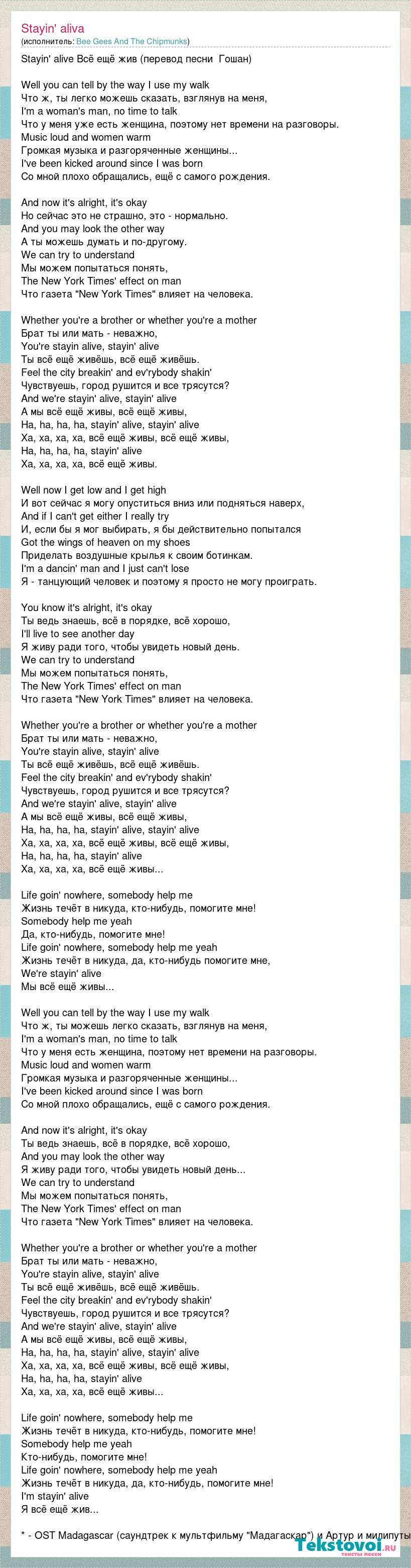 Stayin' alive Всё ещё жив (перевод песни Гошан) Well you can tell by the way I use my walk Что ж, ты легко можешь сказать, взглянув на меня, I'm a woman's man, no time to talk Что у меня уже есть женщина, поэтому нет времени на разговоры. Music loud and women warm Громкая музыка и разгоряченные женщины... I've been kicked around since I was born Со мной плохо обращались, ещё с самого рождения. And now it's alright, it's okay Но сейчас это не страшно, это - нормально. And you may look the other way А ты можешь думать и по-другому. We can try to understand Мы можем попытаться понять, The New York Times' effect on man Что газета "New York Times" влияет на человека. Whether you're a brother or whether you're a mother Брат ты или мать - неважно, You're stayin alive, stayin' alive Ты всё ещё живёшь, всё ещё живёшь. Feel the city breakin' and ev'rybody shakin' Чувствуешь, город рушится и все трясутся? And we're stayin' alive, stayin' alive А мы всё ещё живы, всё ещё живы, Ha, ha, ha, ha, stayin' alive, stayin' alive Ха, ха, ха, ха, всё ещё живы, всё ещё живы, Ha, ha, ha, ha, stayin' alive Ха, ха, ха, ха, всё ещё живы. Well now I get low and I get high И вот сейчас я могу опуститься вниз или подняться наверх, And if I can't get either I really try И, если бы я мог выбирать, я бы действительно попытался Got the wings of heaven on my shoes Приделать воздушные крылья к своим ботинкам. I'm a dancin' man and I just can't lose Я - танцующий человек и поэтому я просто не могу проиграть. You know it's alright, it's okay Ты ведь знаешь, всё в порядке, всё хорошо, I'll live to see another day Я живу ради того, чтобы увидеть новый день. We can try to understand Мы можем попытаться понять, The New York Times' effect on man Что газета "New York Times" влияет на человека. Whether you're a brother or whether you're a mother Брат ты или мать - неважно, You're stayin alive, stayin' alive Ты всё ещё живёшь, всё ещё живёшь. Feel the city breakin' and ev'rybody shakin' Чувствуешь, город рушится и все трясутся? And we're stayin' alive, stayin' alive А мы всё ещё живы, всё ещё живы, Ha, ha, ha, ha, stayin' alive, stayin' alive Ха, ха, ха, ха, всё ещё живы, всё ещё живы, Ha, ha, ha, ha, stayin' alive Ха, ха, ха, ха, всё ещё живы... Life goin' nowhere, somebody help me Жизнь течёт в никуда, кто-нибудь, помогите мне! Somebody help me yeah Да, кто-нибудь, помогите мне! Life goin' nowhere, somebody help me yeah Жизнь течёт в никуда, да, кто-нибудь помогите мне, We're stayin' alive Мы всё ещё живы... Well you can tell by the way I use my walk Что ж, ты можешь легко сказать, взглянув на меня, I'm a woman's man, no time to talk Что у меня есть женщина, поэтому нет времени на разговоры. Music loud and women warm Громкая музыка и разгоряченные женщины... I've been kicked around since I was born Со мной плохо обращались, ещё с самого рождения. And now it's alright, it's okay Ты ведь знаешь, всё в порядке, всё хорошо, And you may look the other way Я живу ради того, чтобы увидеть новый день... We can try to understand Мы можем попытаться понять, The New York Times' effect on man Что газета "New York Times" влияет на человека. Whether you're a brother or whether you're a mother Брат ты или мать - неважно, You're stayin alive, stayin' alive Ты всё ещё живёшь, всё ещё живёшь. Feel the city breakin' and ev'rybody shakin' Чувствуешь, город рушится и все трясутся? And we're stayin' alive, stayin' alive А мы всё ещё живы, всё ещё живы, Ha, ha, ha, ha, stayin' alive, stayin' alive Ха, ха, ха, ха, всё ещё живы, всё ещё живы, Ha, ha, ha, ha, stayin' alive Ха, ха, ха, ха, всё ещё живы... Life goin' nowhere, somebody help me Жизнь течёт в никуда, кто-нибудь, помогите мне! Somebody help me yeah Кто-нибудь, помогите мне! Life goin' nowhere, somebody help me yeah Жизнь течёт в никуда, да, кто-нибудь, помогите мне! I'm stayin' alive Я всё ещё жив... * - OST Madagascar (cаундтрек к мультфильму "Мадагаскар") и Артур и милипуты