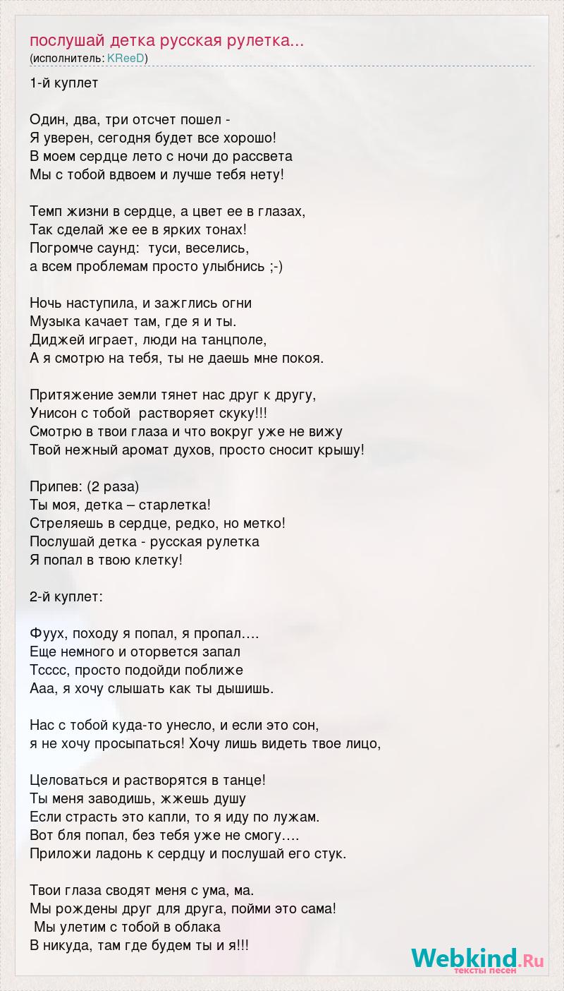 1-й куплет Один, два, три отсчет пошел - Я уверен, сегодня будет все хорошо! В моем сердце лето с ночи до рассвета Мы с тобой вдвоем и лучше тебя нету! Темп жизни в сердце, а цвет ее в глазах, Так сделай же ее в ярких тонах! Погромче саунд: туси, веселись, а всем проблемам просто улыбнись ;-) Ночь наступила, и зажглись огни Музыка качает там, где я и ты. Диджей играет, люди на танцполе, А я смотрю на тебя, ты не даешь мне покоя. Притяжение земли тянет нас друг к другу, Унисон с тобой растворяет скуку!!! Смотрю в твои глаза и что вокруг уже не вижу Твой нежный аромат духов, просто сносит крышу! Припев: (2 раза) Ты моя, детка – старлетка! Стреляешь в сердце, редко, но метко! Послушай детка - русская рулетка Я попал в твою клетку! 2-й куплет: Фуух, походу я попал, я пропал…. Еще немного и оторвется запал Тсссс, просто подойди поближе Ааа, я хочу слышать как ты дышишь. Нас с тобой куда-то унесло, и если это сон, я не хочу просыпаться! Хочу лишь видеть твое лицо, Целоваться и растворятся в танце! Ты меня заводишь, жжешь душу Если страсть это капли, то я иду по лужам. Вот бля попал, без тебя уже не смогу…. Приложи ладонь к сердцу и послушай его стук. Твои глаза сводят меня с ума, ма. Мы рождены друг для друга, пойми это сама! Мы улетим с тобой в облака В никуда, там где будем ты и я!!!