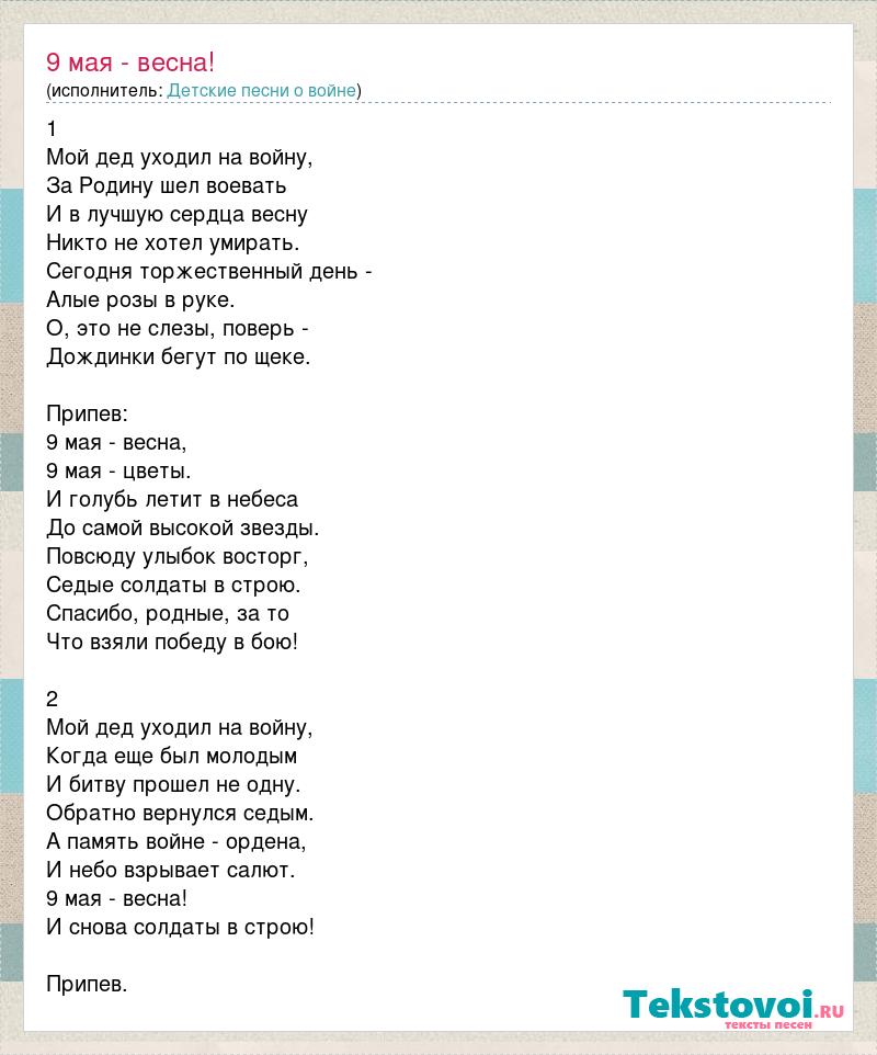 1 Мой дед уходил на войну, За Родину шел воевать И в лучшую сердца весну Никто не хотел умирать. Сегодня торжественный день - Алые розы в руке. О, это не слезы, поверь - Дождинки бегут по щеке. Припев: 9 мая - весна, 9 мая - цветы. И голубь летит в небеса До самой высокой звезды. Повсюду улыбок восторг, Седые солдаты в строю. Спасибо, родные, за то Что взяли победу в бою! 2 Мой дед уходил на войну, Когда еще был молодым И битву прошел не одну. Обратно вернулся седым. А память войне - ордена, И небо взрывает салют. 9 мая - весна! И снова солдаты в строю! Припев.