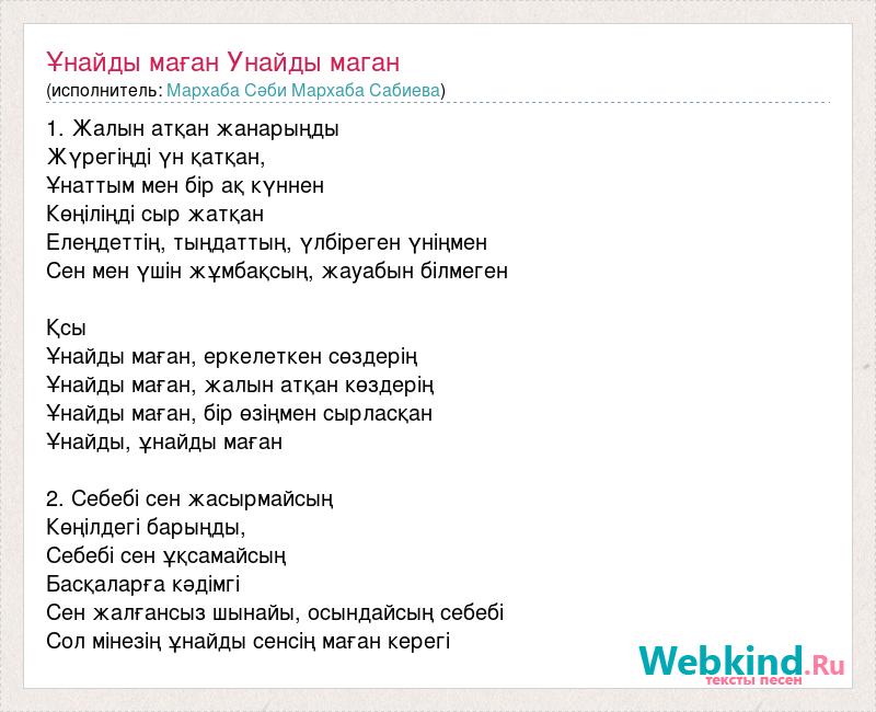 1. Жалын атқан жанарыңды Жүрегіңді үн қатқан, Ұнаттым мен бір ақ күннен Көңіліңді сыр жатқан Елеңдеттің, тыңдаттың, үлбіреген үніңмен Сен мен үшін жұмбақсың, жауабын білмеген Қсы Ұнайды маған, еркелеткен сөздерің Ұнайды маған, жалын атқан көздерің Ұнайды маған, бір өзіңмен сырласқан Ұнайды, ұнайды маған 2. Себебі сен жасырмайсың Көңілдегі барыңды, Себебі сен ұқсамайсың Басқаларға кәдімгі Сен жалғансыз шынайы, осындайсың себебі Сол мінезің ұнайды сенсің маған керегі
