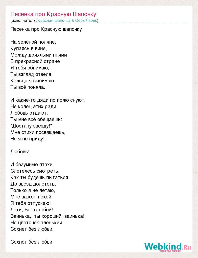 Песенка про Красную шапочку На зелёной поляне, Купаясь в вине, Между дряхлыми пнями В прекрасной стране Я тебя обнимаю, Ты взгляд отвела, Кольца я вынимаю - Ты всё поняла. И какие-то дяди по полю снуют, Не колец этих ради Любовь отдают. Ты мне всё обещаешь: "Достану звезду!" Мне стихи посвящаешь, Но я не приду! Любовь! И безумные птахи Слетелесь смотреть, Как ты будешь пытаться До звёзд долететь. Только я не летаю, Мне важен покой. Я тебя отпускаю: Лети, Бог с тобой! Заинька, ты хороший, заинька! Но цветочек аленький Сохнет без любви. Сохнет без любви!