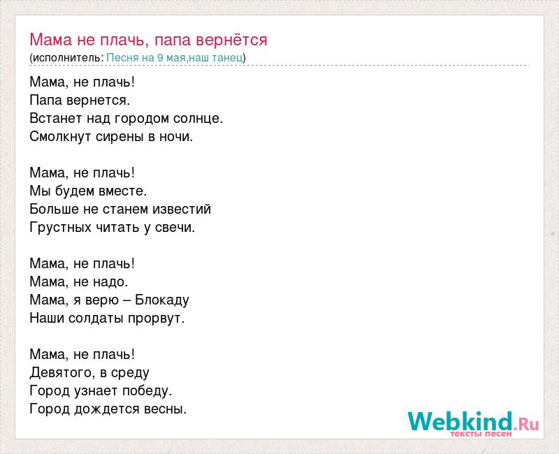 Мама, не плачь! Папа вернется. Встанет над городом солнце. Смолкнут сирены в ночи. Мама, не плачь! Мы будем вместе. Больше не станем известий Грустных читать у свечи. Мама, не плачь! Мама, не надо. Мама, я верю – Блокаду Наши солдаты прорвут. Мама, не плачь! Девятого, в среду Город узнает победу. Город дождется весны.