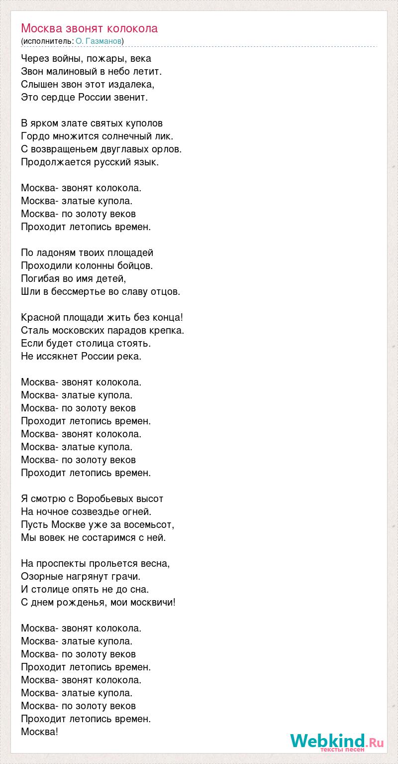 Через войны, пожары, века Звон малиновый в небо летит. Слышен звон этот издалека, Это сердце России звенит. В ярком злате святых куполов Гордо множится солнечный лик. С возвращеньем двуглавых орлов. Продолжается русский язык. Москва- звонят колокола. Москва- златые купола. Москва- по золоту веков Проходит летопись времен. По ладоням твоих площадей Проходили колонны бойцов. Погибая во имя детей, Шли в бессмертье во славу отцов. Красной площади жить без конца! Сталь московских парадов крепка. Если будет столица стоять. Не иссякнет России река. Москва- звонят колокола. Москва- златые купола. Москва- по золоту веков Проходит летопись времен. Москва- звонят колокола. Москва- златые купола. Москва- по золоту веков Проходит летопись времен. Я смотрю с Воробьевых высот На ночное созвездье огней. Пусть Москве уже за восемьсот, Мы вовек не состаримся с ней. На проспекты прольется весна, Озорные нагрянут грачи. И столице опять не до сна. С днем рожденья, мои москвичи! Москва- звонят колокола. Москва- златые купола. Москва- по золоту веков Проходит летопись времен. Москва- звонят колокола. Москва- златые купола. Москва- по золоту веков Проходит летопись времен. Москва!