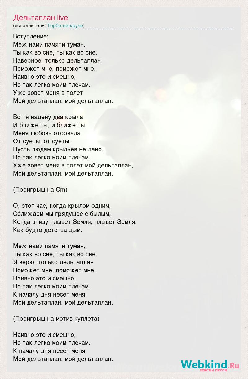 Вступление: Меж нами памяти туман, Ты как во сне, ты как во сне. Наверное, только дельтаплан Поможет мне, поможет мне. Наивно это и смешно, Но так легко моим плечам. Уже зовет меня в полет Мой дельтаплан, мой дельтаплан. Вот я надену два крыла И ближе ты, и ближе ты. Меня любовь оторвала От суеты, от суеты. Пусть людям крыльев не дано, Но так легко моим плечам. Уже зовет меня в полет мой дельтаплан, Мой дельтаплан, мой дельтаплан. (Проигрыш на Cm) О, этот час, когда крылом одним, Сближаем мы грядущее с былым, Когда внизу плывет Земля, плывет Земля, Как будто детства дым. Меж нами памяти туман, Ты как во сне, ты как во сне. Я верю, только дельтаплан Поможет мне, поможет мне. Наивно это и смешно, Но так легко моим плечам. К началу дня несет меня Мой дельтаплан, мой дельтаплан. (Проигрыш на мотив куплета) Наивно это и смешно, Но так легко моим плечам. К началу дня несет меня Мой дельтаплан, мой дельтаплан.