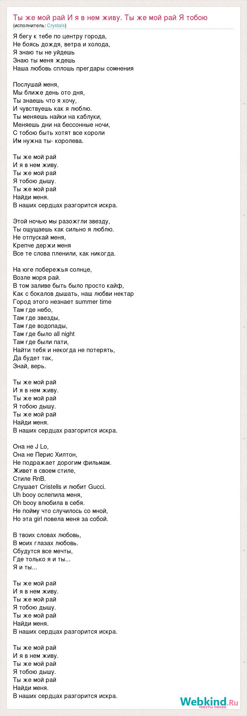 Я бегу к тебе по центру города, Не боясь дождя, ветра и холода, Я знаю ты не уйдешь Знаю ты меня ждешь Наша любовь сплошь прегдары сомнения Послушай меня, Мы ближе день ото дня, Ты знаешь что я хочу, И чувствуешь как я люблю. Ты меняешь найки на каблуки, Меняешь дни на бессонные ночи, С тобою быть хотят все короли Им нужна ты- королева. Ты же мой рай И я в нем живу. Ты же мой рай Я тобою дышу. Ты же мой рай Найди меня. В наших сердцах разгорится искра. Этой ночью мы разожгли звезду, Ты ощущаешь как сильно я люблю. Не отпускай меня, Крепче держи меня Все те слова пленили, как никогда. На юге побережья cолнце, Возле моря рай. В том заливе быть было просто кайф, Как с бокалов дышать, наш любви нектар Город этого незнает summer time Там где небо, Там где звезды, Там где водопады, Там где было all night Там где были пати, Найти тебя и некогда не потерять, Да будет так, Знай, верь. Ты же мой рай И я в нем живу. Ты же мой рай Я тобою дышу. Ты же мой рай Найди меня. В наших сердцах разгорится искра. Она не J Lo, Она не Перис Хилтон, Не подражает дорогим фильмам. Живет в своем стиле, Стиле RnB. Cлушает Cristells и любит Gucci. Uh booy ослепила меня, Оh booy влюбила в себя. Не пойму что случилось со мной, Но эта girl повела меня за собой. В твоих словах любовь, В моих глазах любовь. Сбудутся все мечты, Где только я и ты... Я и ты... Ты же мой рай И я в нем живу. Ты же мой рай Я тобою дышу. Ты же мой рай Найди меня. В наших сердцах разгорится искра. Ты же мой рай И я в нем живу. Ты же мой рай Я тобою дышу. Ты же мой рай Найди меня. В наших сердцах разгорится искра.