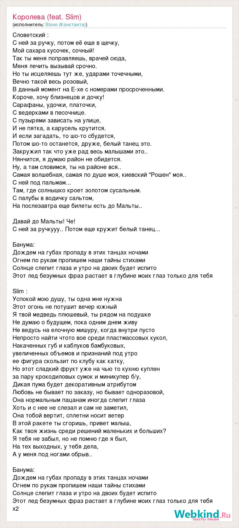 Словетский : С ней за ручку, потом её еще в щечку, Мой сахара кусочек, сочный! Так ты меня поправляешь, врачей сюда, Меня лечить вызывай срочно. Но ты исцеляешь тут же, ударами точечными, Вечно такой весь розовый, В данный момент на Е-хе с номерами просроченными. Короче, хочу близнецов и дочку! Сарафаны, удочки, платочки, С ведерками в песочнице. С пузырями зависать на улице, И не пятка, а карусель крутится. И если загадать, то шо-то сбудется, Потом шо-то останется, друже, белый танец это. Закружил так что уже рад весь малышами это.. Нянчится, я думаю район не обидется. Ну, а там словимся, ты на районе вся.. Самая волшебная, самая по душе моя, киевский "Рошен" моя.. С ней под пальмам... Там, где солнышко кроет золотом сусальным. С палубы в водичку сальтом, На послезавтра еще билеты есть до Мальты.. Давай до Мальты! Че! С ней за ручкууу.. Потом еще кружит белый танец... Банума: Дождем на губах пропаду в этих танцах ночами Огнем по рукам пропишем наши тайны стихами Солнце слепит глаза и утро на двоих будет испито Этот лед безумных фраз растает в глубине моих глаз только для тебя Slim : Успокой мою душу, ты одна мне нужна Этот огонь не потушит вечер южный Я твой медведь плюшевый, ты рядом на подушке Не думаю о будущем, пока одним днем живу Не ведусь на елочную мишуру, когда внутри пусто Непросто найти чтото вое среди пластмассовых кукол, Накаченных губ и каблуков бамбуковых, увеличенных объемов и признаний под утро ее фигура скользит по клубу как катку, Но этот сладкий фрукт уже на чью то кухню куплен за пару крокодиловых сумок и миникупер б/у, Дикая пума будет декоративным атрибутом Любовь не бывает по заказу, но бывает одноразовой, Она нормальным пацанам иногда слепит глаза Хоть и с нее не слезал и сам не заметил, Она тобой вертит, сплетни носит ветер В этой ракете ты сгоришь, привет малыш, Как твоя жизнь среди решений маленьких и больших? Я тебя не забыл, но не помню где я был, На тех выходных, у тебя дела, А у меня под ногами обрыв.. Банума: Дождем на губах пропаду в этих танцах ночами Огнем по рукам пропишем наши тайны стихами Солнце слепит глаза и утро на двоих будет испито Этот лед безумных фраз растает в глубине моих глаз только для тебя x2